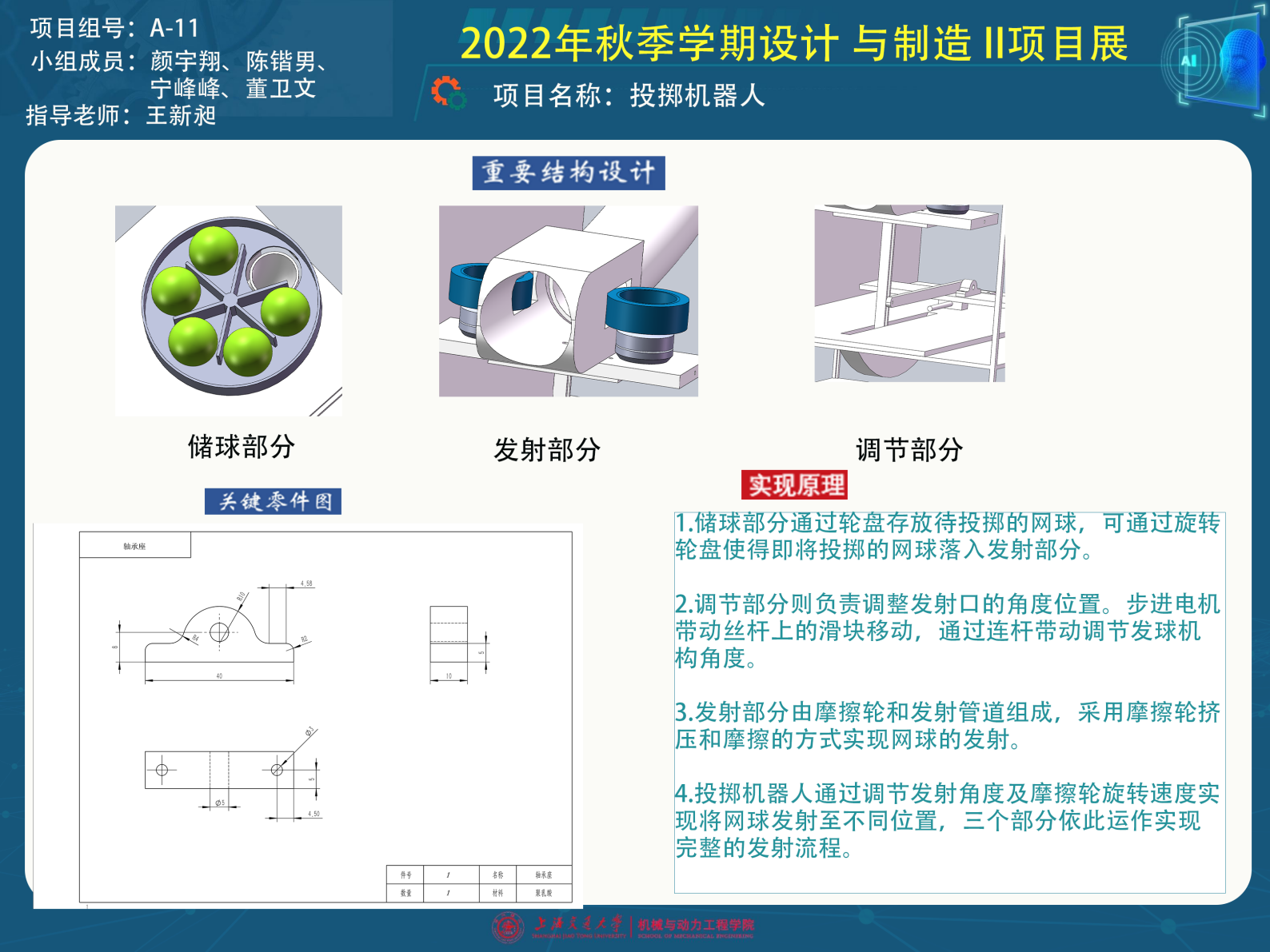 本项目的投掷机器人主要分为储球、调节、发射三个部分。储球部分通过轮盘存放待投掷的网球,可通过旋转轮盘使得即将投掷的网球落入发射部分。调节部分则负责调整发射口的角度位置。发射部分由摩擦轮和发射管道组成,采用摩擦轮挤压和摩擦的方式实现网球的发射。投掷机器人通过调节发射角度及摩擦轮旋转速度实现将网球发射至不同位置,三个部分依此运作实现完整的发射流程。本项目拟使用铝钢材和亚克力板搭建主体部分,通过3D打印的方式制造特殊零部件,再利用标准零件进行组装,完成投掷机器人的制作。