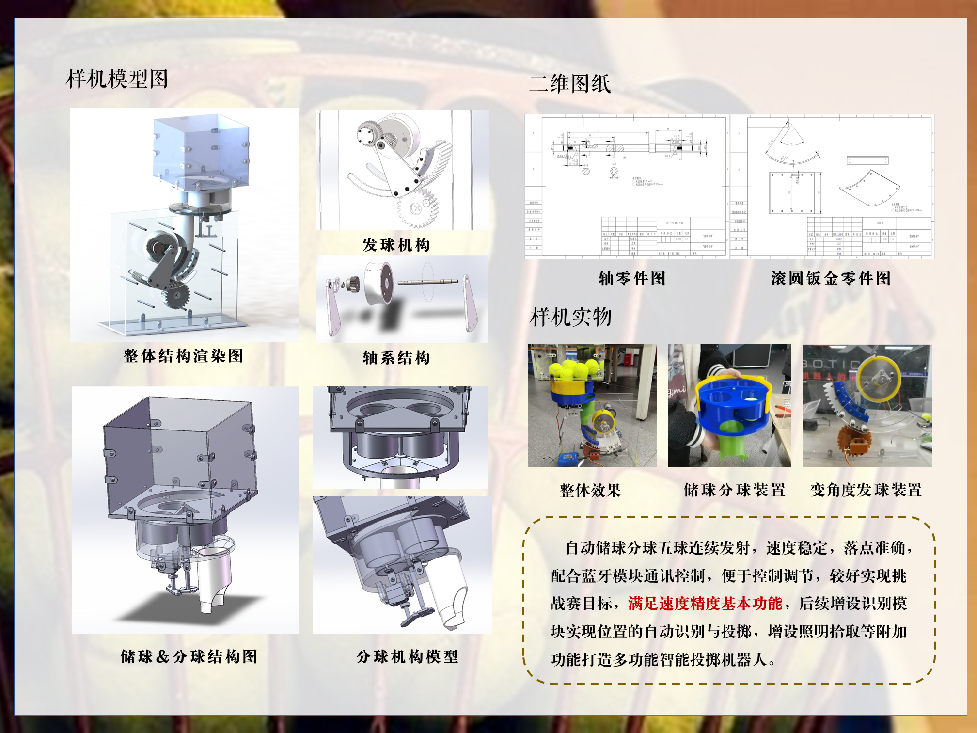 在此基础上,我们设计了单飞轮模式以提高稳定性;设计了储球环节实现普适性存球分球;能够至少五球连续发球,通过活动轨道的角度调节控制发球方向;高稳定性,连续投掷过程中保持精度速度稳定;结构简单化,降低成本;利用蓝牙模块与手机相连,做到远程调控。