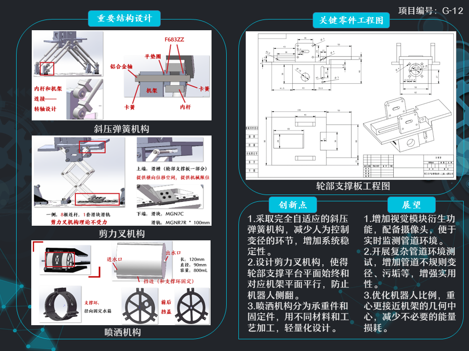 管道,遍布在我们生活的四处,从每家每户到商场大楼、图书馆,都能见到各种各样的管道。这些管道在日常生活中难以清洁,很容易变成清洁死角,尤其是垂直设立的长管道,拆卸清理都变得不易。时间未经清洁的管道不仅滋生细菌、产生异味,在新冠疫情的当下,还容易成为飞沫传输的途径。管道消毒机器人项目,意在设计出一种可以清理消毒管道的方案,即可以适应不同管径(本项目为直径30cm~50cm)、各种倾角的管道,且可在管道内部移动、喷洒清洁的机器人,使得平时难以清洁的卫生死角得以清理。