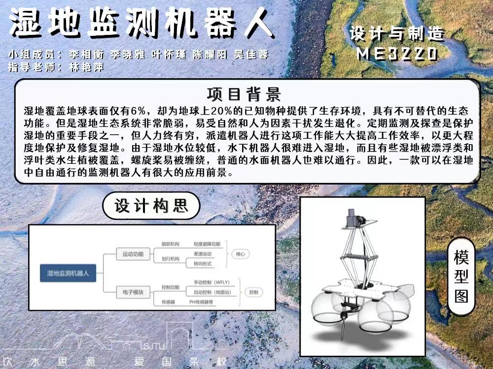 中国湿地面积占世界湿地的10%,持续监测及大面积探查是湿地保护的重要手段之一,但人力终有穷,派遣机器人代替人类进行这项工作能大大提高工作效率,更大程度地保护及修复湿地。然而现有机器人在湿地中的通行有以下两个方面的困难:湿地水位较低,水下机器人很难进入湿地;有些湿地被漂浮类和浮叶类水生植被覆盖,螺旋桨易被缠绕,普通的水面机器人难以通行。本项目旨在设计制造一款可以在湿地中自由通行的监测机器人。