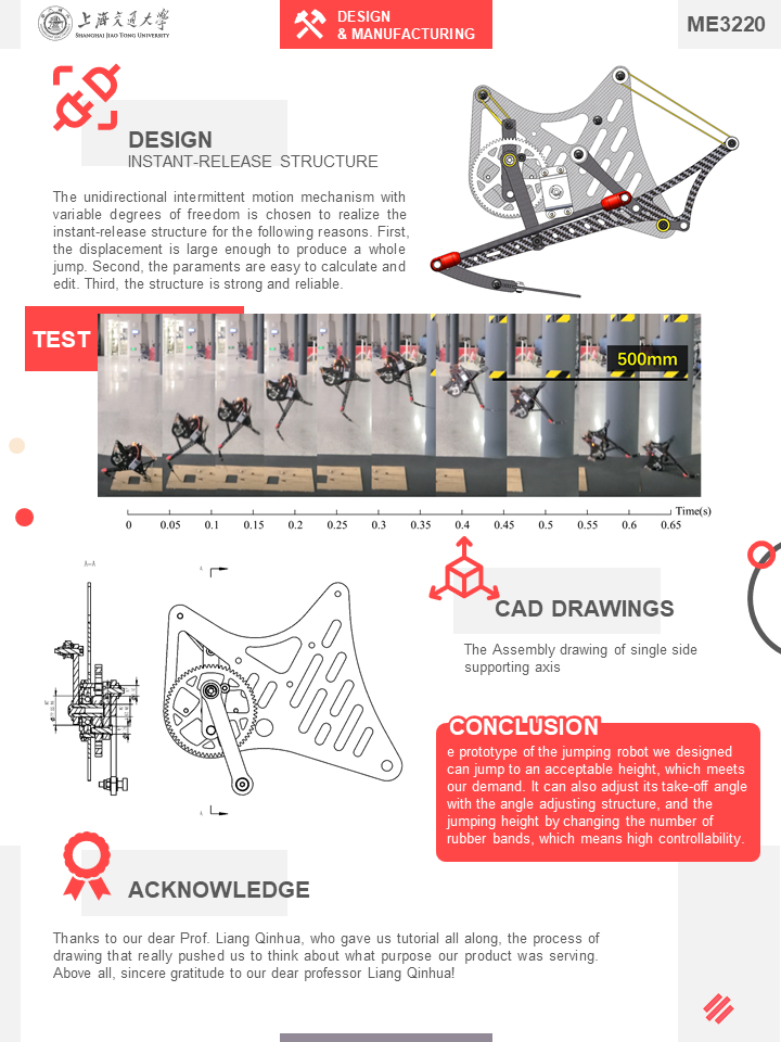 基于设计与制造Ⅱ课程项目所设置的项目挑战赛——跳跃机器人,本组设计了一种基于变自由度单向间歇运动机构的跳跃机器人。该跳跃机器人动力源由航模电池提供,由电机驱动,通过齿轮旋转带动机器人腿收缩,同时橡皮筋蓄力储存能量;当齿轮旋转至某一点后,连接杆迅速与动力源脱啮合,实现能量的迅速释放和腿部伸长,进而带动机器人实现跳跃。同时利用辅助橡皮筋,降低了电机最大负载。机器人重新落回地面后,仍可以继续由电机带动蓄力。同时,基于ESP32控制板,实现了利用蓝牙在手机进行远程遥控跳跃的功能。