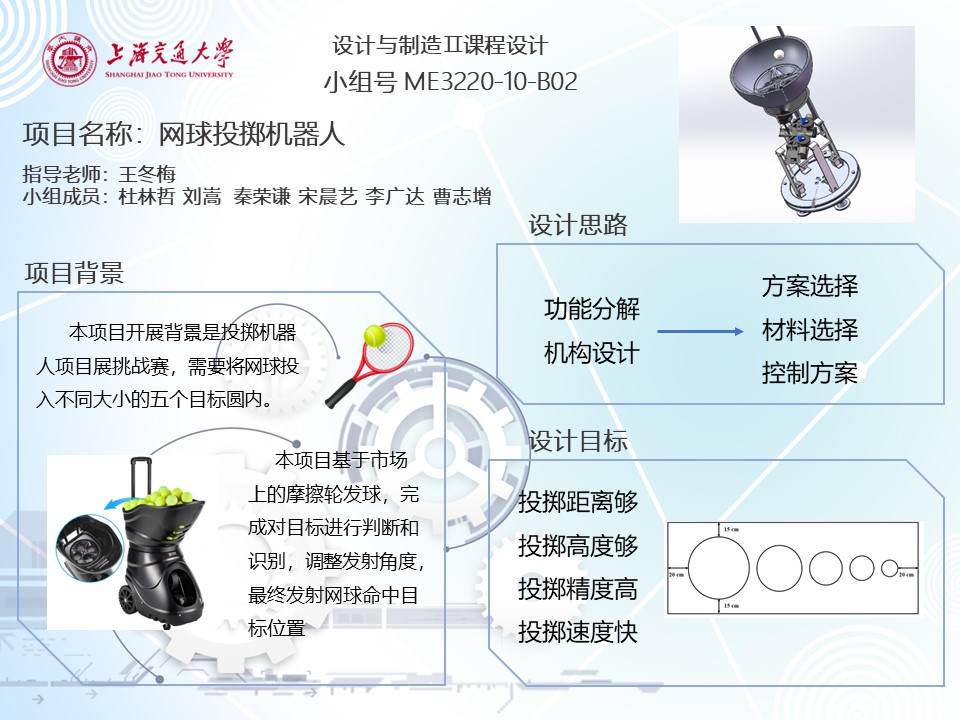 本项目开展背景是投掷机器人项目展挑战赛,需要将网球投入不同大小的五个目标圆内。同时,网球投掷的机器人在市场上也有着广阔的应用前景,能够完成特定目标和角度的投掷机参与辅助教学可以更好的提高学生的网球技术动作,更有助于提高学生学习网球的兴趣性、积极性和主动性,更有助于教师个别指导。本项目设计了一种自动识别目标的网球投掷机器人,能够完成各种目标的投掷任务。