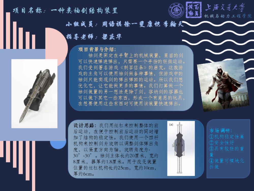 本项目旨在于设计一个类袖剑装置。此装置可以如游戏以及影视作品《刺客信条》中一样绑在手臂上并隐藏在衣服袖子内。除了传统意义上的剑,我们的类袖剑装置还可以将一些其他轻薄的物品放在装置中。只需要手指的拨动,装置内的物品就可以实现快速弹出和快速收回。这个装置兼具实用性和观赏性,在日常生活中也有应用价值。例如可以把二维码放置在装置内,在需要扫码时可以快速出示,节省了打开手机的时间。