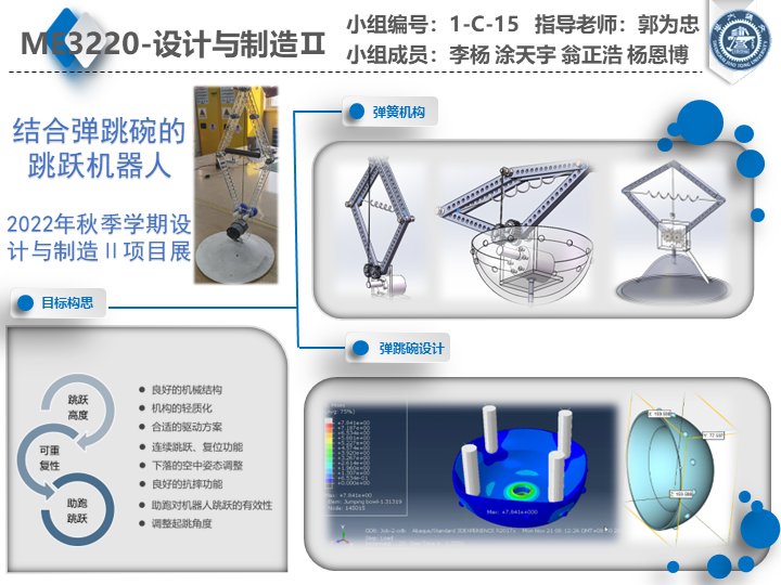 本项目启发于市面上的小型弹跳碗玩具,经过调研提出了一种通过电机和拉绳传动,将弹簧机构和弹跳碗机构结合在一起的跳跃机器人。项目中包含了弹簧机构的计算仿真、弹跳碗设计的计算仿真、零件的校核以及重要零部件的设计,并给出了相应的模型。在最后阶段完成了部分样机的搭建,并利用传感器的测试装置完成了相关力学、运动学量的测定。
