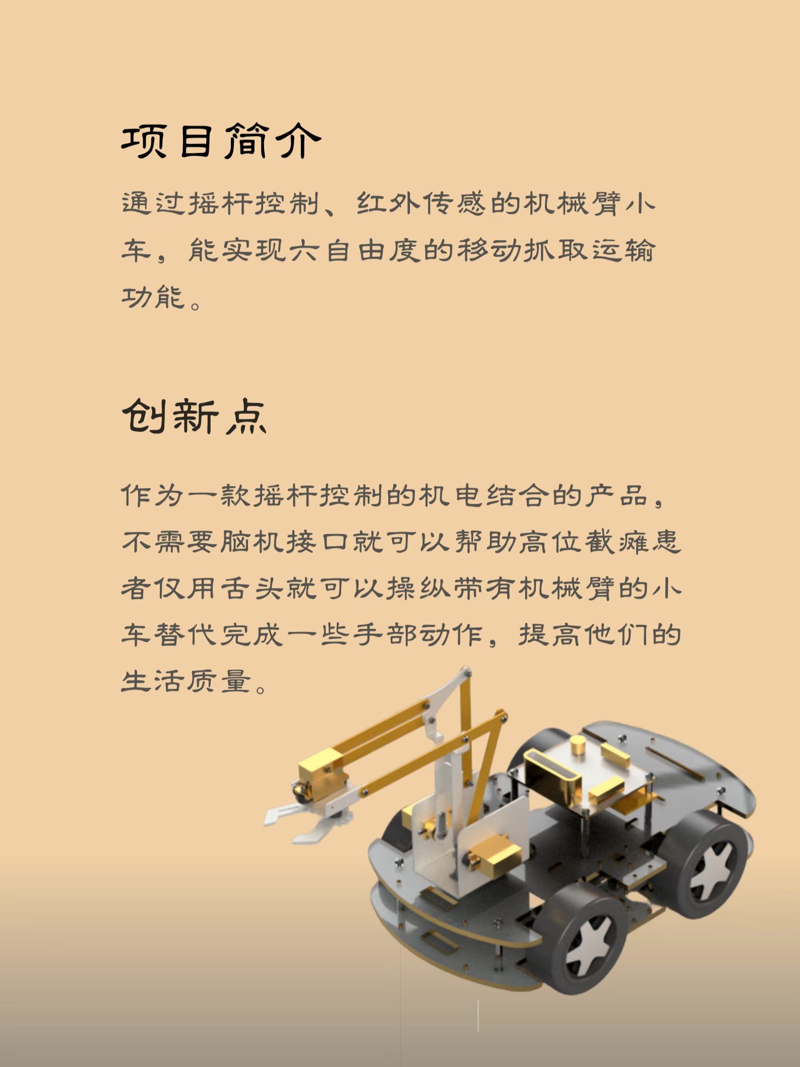 四肢残疾患者或高位截瘫患者虽然四肢功能丧失,但绝大部分患者的神志清醒且舌头能正常活动,并且舌头具有运动直观、抗疲劳性强、不受自身运动状态影响等多种优点。根据四肢残疾人面临的问题以及他们的需求,本小组的项目目标是用舌头控制外装的机械摇杆,利用红外传感技术,采用Arduino开发板,通过不同的操作模式来控制机械臂拿取用品、翻阅文本、使用电子产品、按铃等,为患者解决一些生活上的需求,改善他们的心理状况。