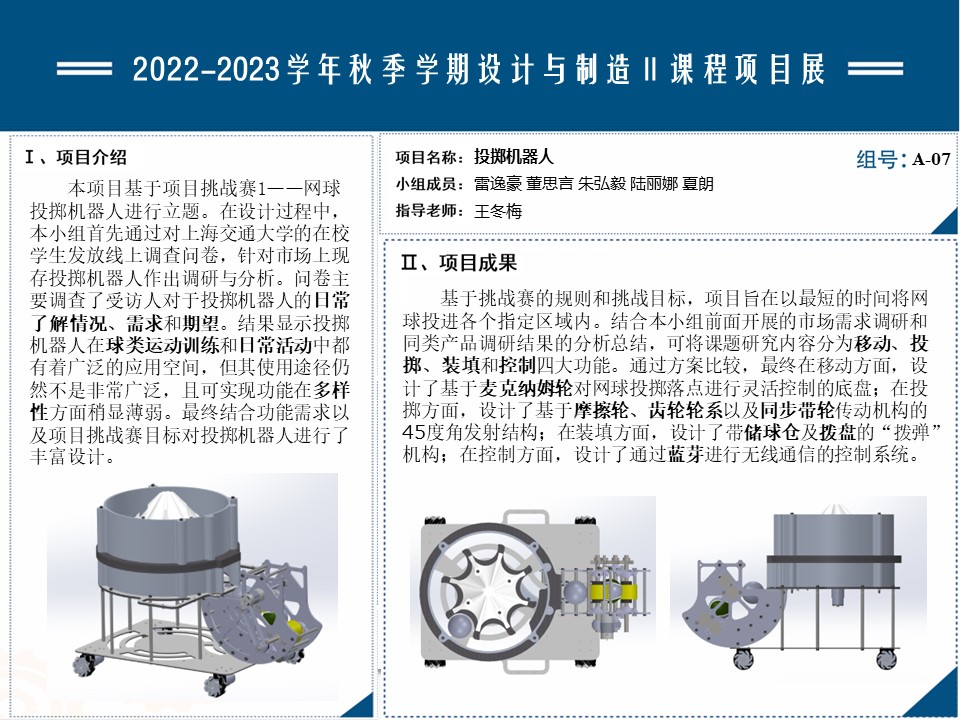 本项目基于项目挑战赛1——网球投掷机器人进行立题。在设计过程中,本小组首先通过对买球官方网站的在校学生发放线上调查问卷,针对市场上现存投掷机器人作出调研与分析。问卷主要调查了受访人对于投掷机器人的日常了解情况、需求和期望。结果显示投掷机器人在球类运动的训练和日常活动中都有着广泛的应用空间,但其使用途径仍然不是非常广泛,且可实现功能在多样性方面稍显薄弱。最终结合功能需求以及项目挑战赛目标对投掷机器人进行了丰富设计。