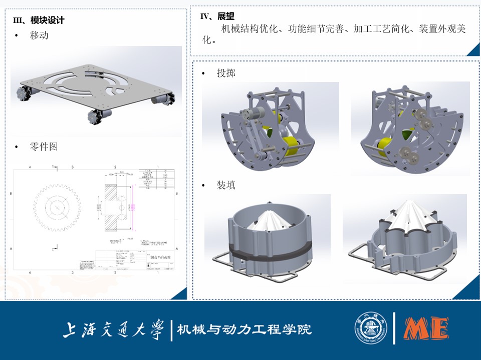 基于挑战赛的规则和挑战目标,项目旨在以最短的时间将网球投进各个指定区域内。结合本小组前面开展的市场需求调研和同类产品调研结果的分析总结,可将课题研究内容分为移动、投掷、装填和控制四大功能。通过方案比较,最终在移动方面,设计了基于麦克纳姆轮对网球投掷落点进行灵活控制的底盘;在投掷方面,设计了基于摩擦轮、齿轮轮系以及同步带轮传动机构的45度角发射结构;在装填方面,设计了带储球仓及拨盘的“拨弹”机构;在控制方面,设计了通过蓝芽进行无线通信的控制系统。