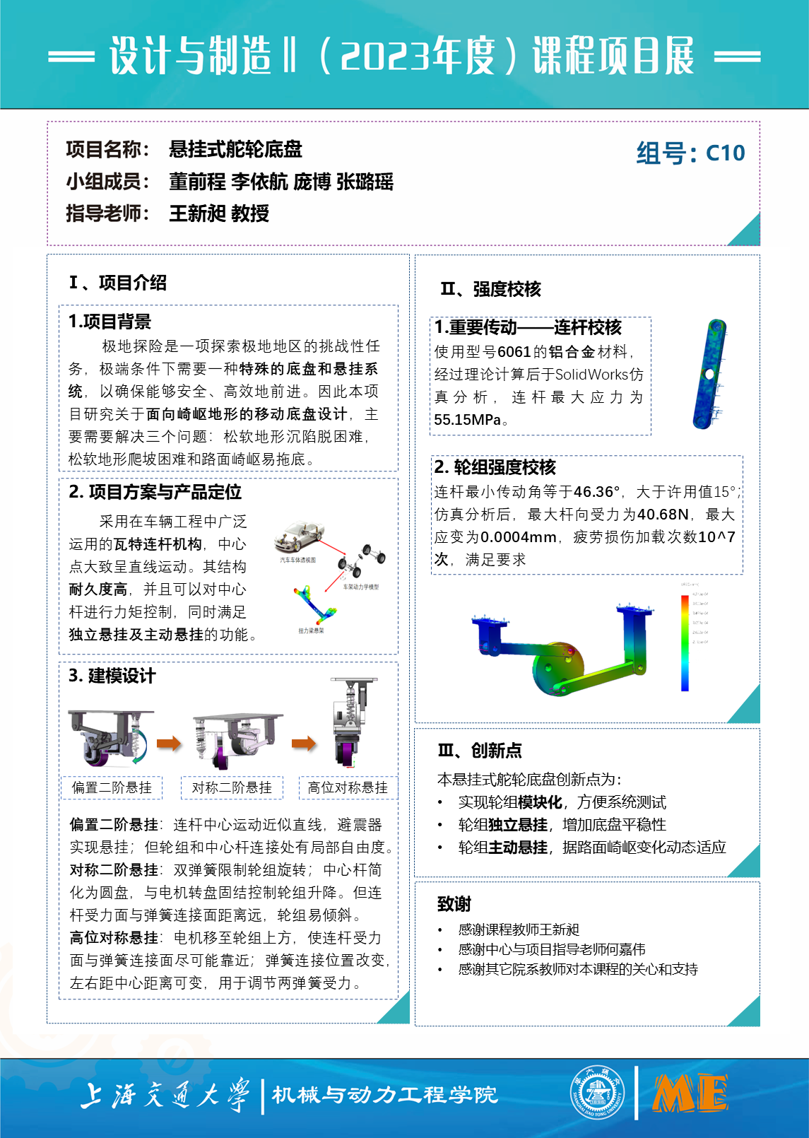 被动悬挂方面,较好地实现底盘的被动悬挂功能,在振动测试中展现出良好的性能;主动悬挂方面,能够达到预计的最大抬升行程,支撑杆、连架杆初步达到强度设计要求。