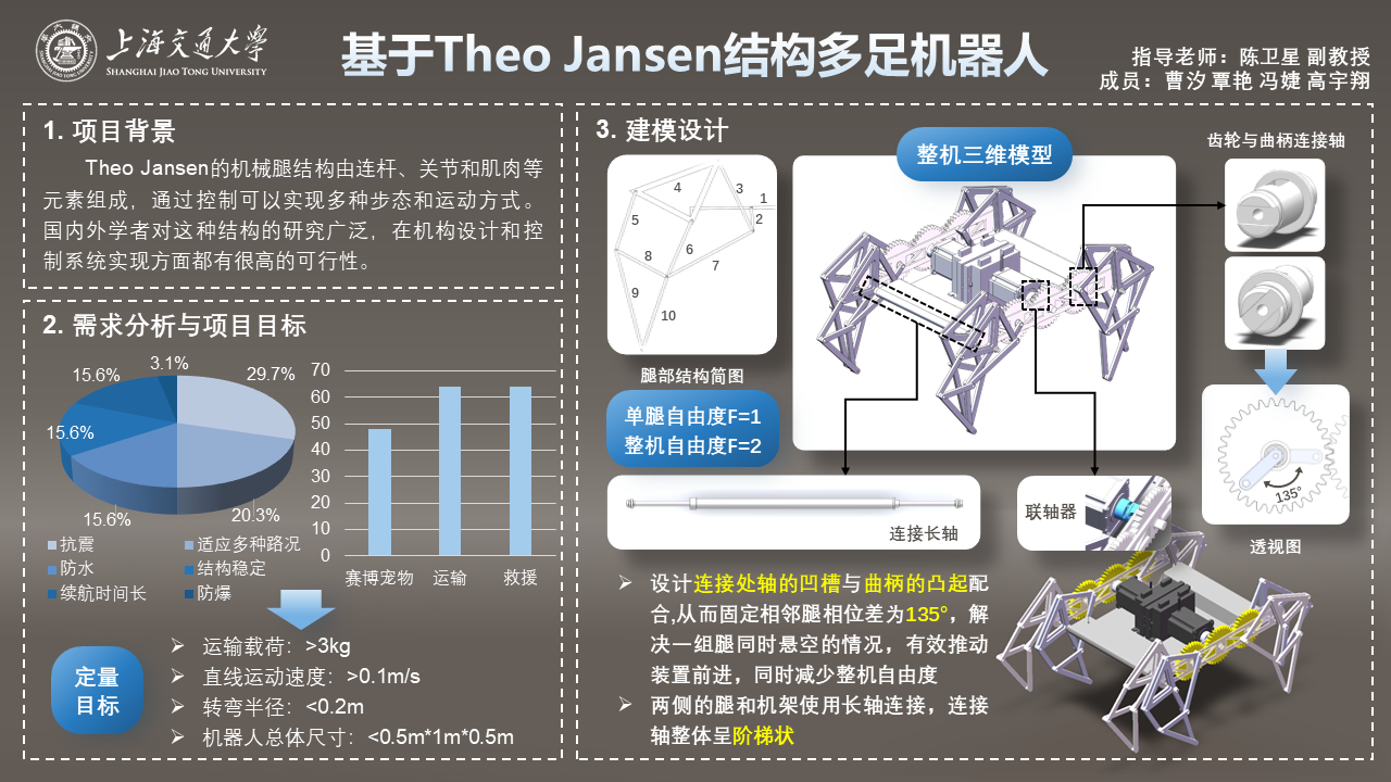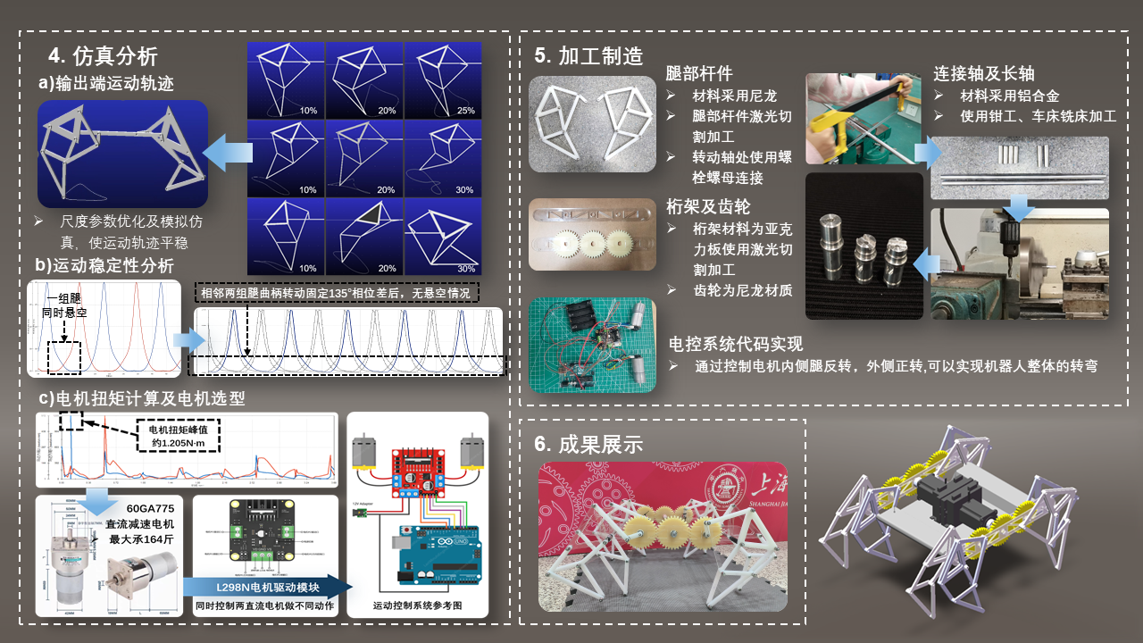 我们通过改进结构设计,使用CAD技术进行模拟和优化,提高Theo Jansen结构的运动稳定性和效率;利用更轻量、强度更高的材料,减轻结构负荷并增加寿命;同时,动力系统优化:对结构的动力传递系统进行改进,从而降低能源消耗并提高运动控制的精度。总之,通过对Theo Jansen结构的综合优化,我们成功提高了其性能和效率,使其更适用于救援场景。这项工作不仅在机器人领域具有潜在应用,还为未来的结构设计和优化提供了有价值的经验。