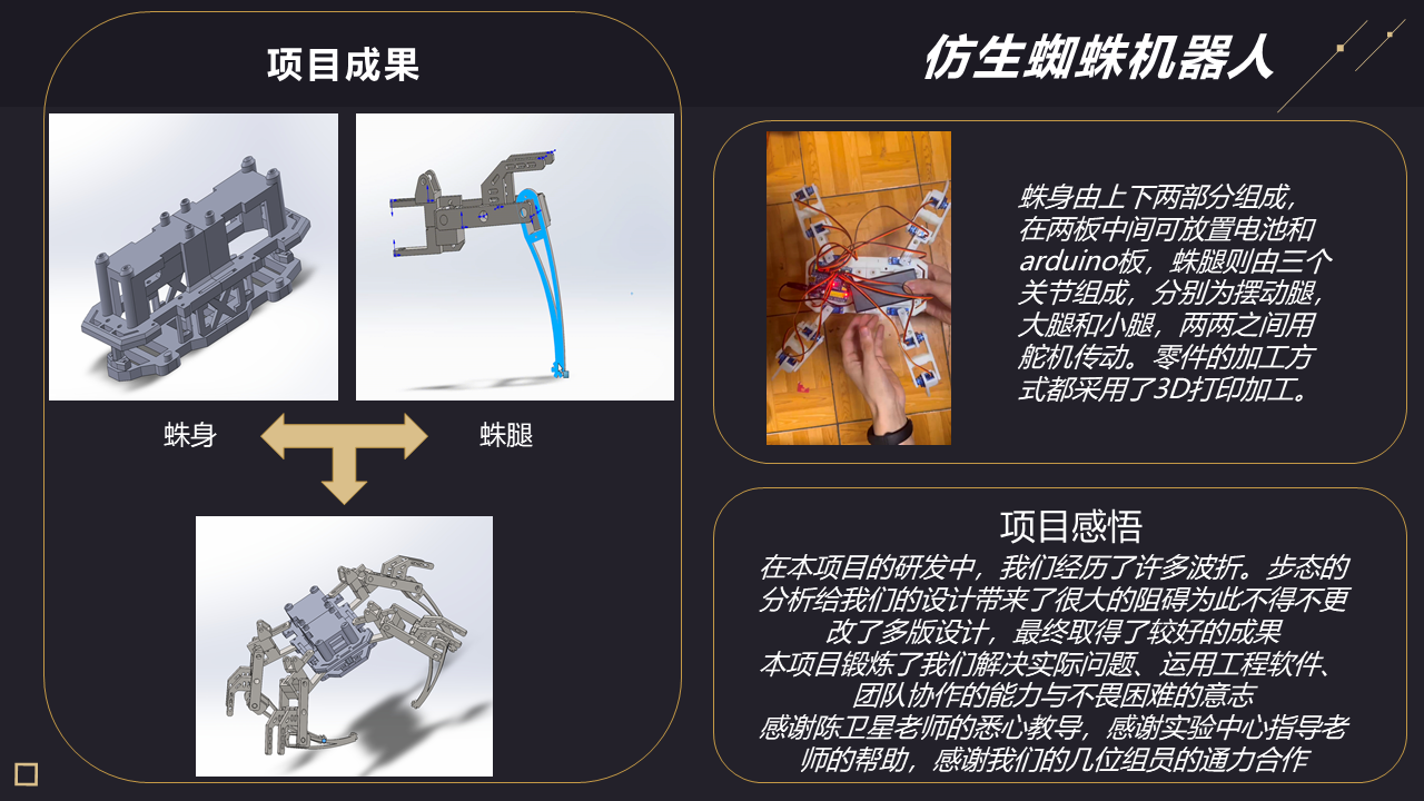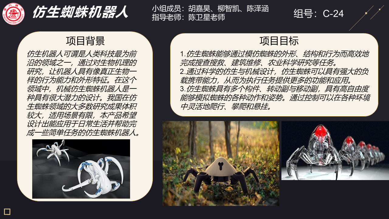 随着科技的不断发展,人类对于仿生机器人的研究也越来越深入。仿生机器人可谓是人类科技最为前沿的领域之一,通过对生物机理的研究,让机器人具有像真正生物一样的行为能力和外形特征。在这个领域中,机械仿生蜘蛛机器人是一种具有很大潜力的设计。我国在仿生蜘蛛领域的大多数研究成果体积较大,适用场景有限,本产品希望设计出能应用于日常生活并帮助完成一些简单任务的仿生蜘蛛机器人。