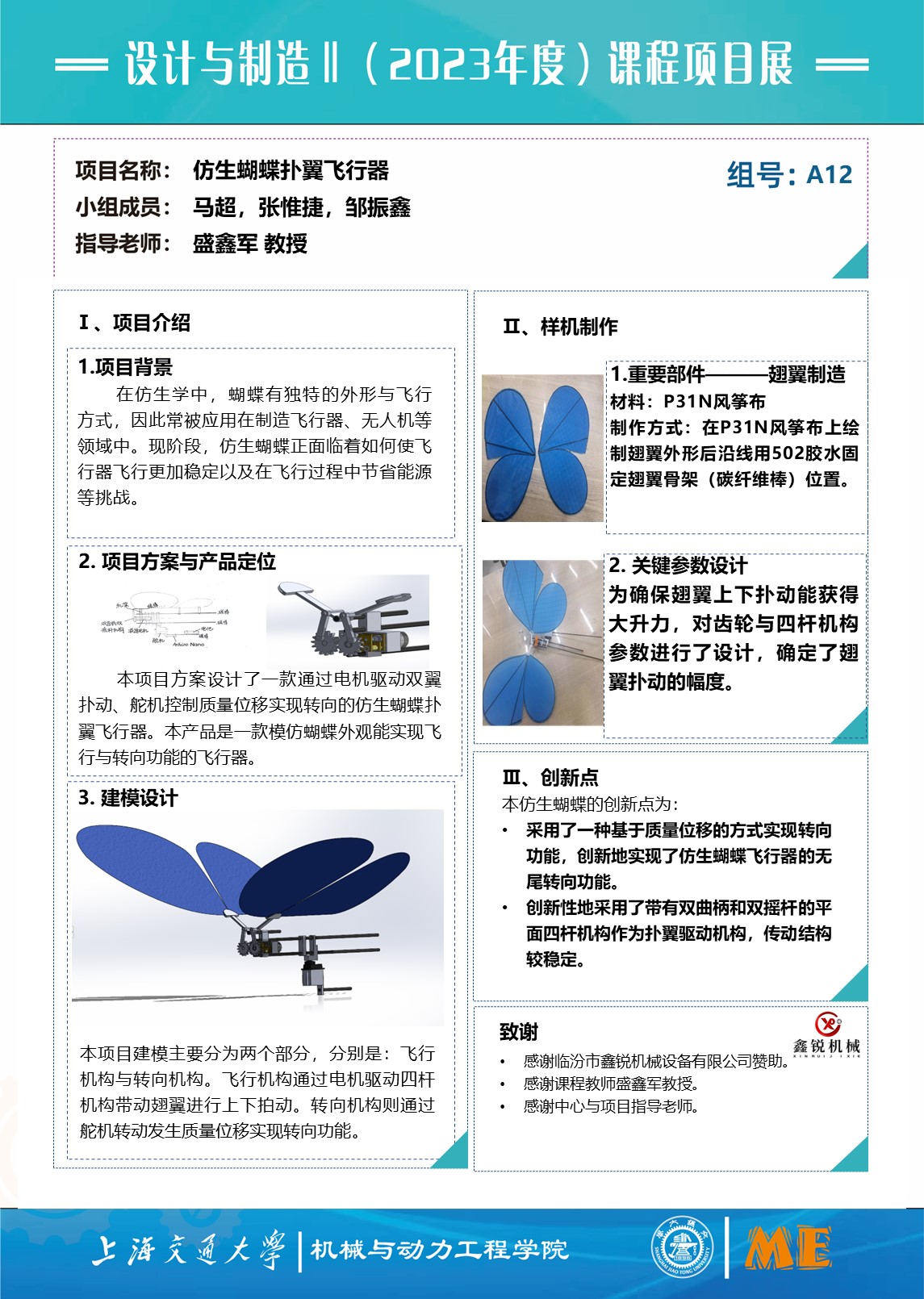在仿生学中,蝴蝶有独特的外形与飞行方式,因此常被应用在制造飞行器、无人机等领域中。现阶段,仿生蝴蝶正面临着如何使飞行器飞行更加稳定以及在飞行过程中节省能源等挑战。本项目旨在设计出一款使用电机实现扑翼,舵机实现转向的仿生蝴蝶飞行器。