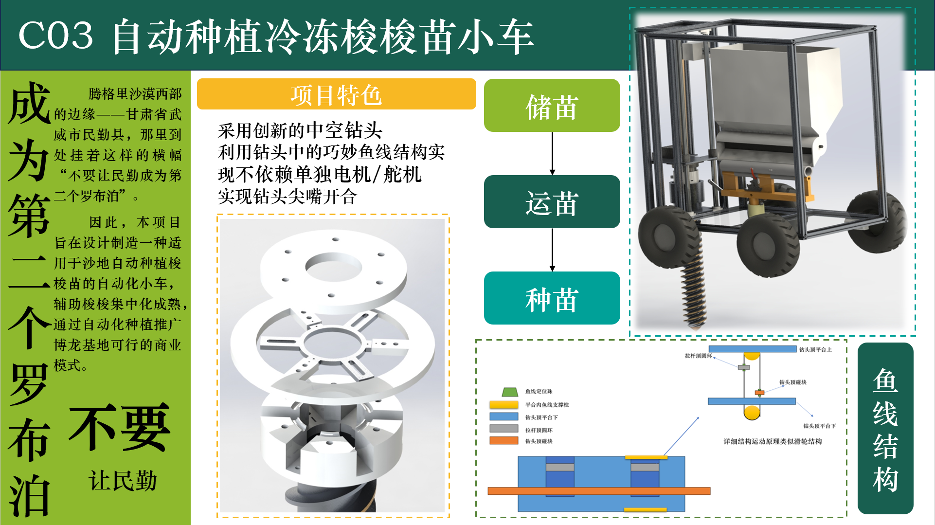 我们最终完成了所有得机械结构,电控方面由于时间不足,没有调试得很完美,我们后续会继续完善这个项目。我们也实现了不使用单独的电机或舵机就可以完成运苗模块中运苗管的开合以及钻头尖嘴的开合,使得苗可以在较深的深度被种下,防止沙土回陷,提高梭梭苗的成活率。