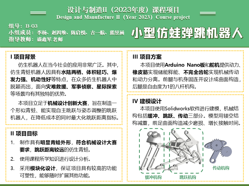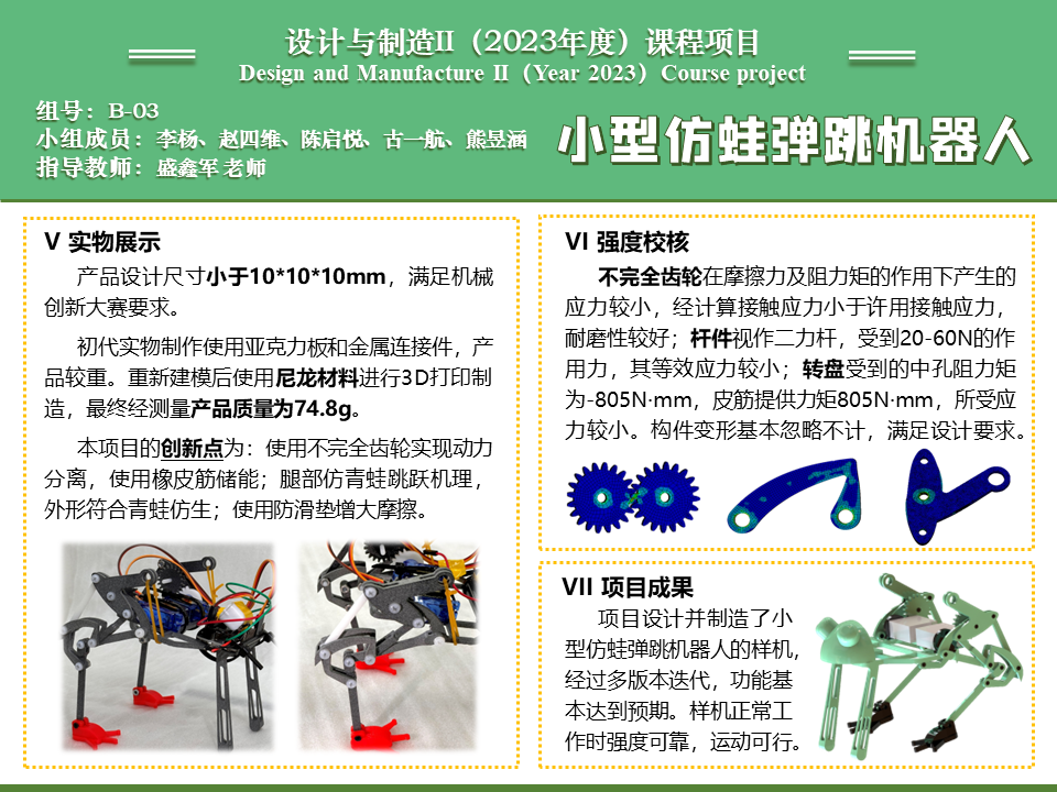 项目设计并且制造了小型仿蛙弹跳机器人的样机,经过多版本迭代,功能基本达到预期。项目通过人工计算、仿真分析等方式对关键构件进行了强度校核,确定样机正常工作时强度可靠;对整机进行了运动学分析,确定运动可行。样机采用模块化设计,各个模块相互组合,保证样机可塑性高,可以根据功能可对其进行再设计。项目同时调研现有同类产品的情况,主要关注点对标比赛要求和课程需求,了解了不同腿部机构的运动特点,最终形成项目报告一篇。