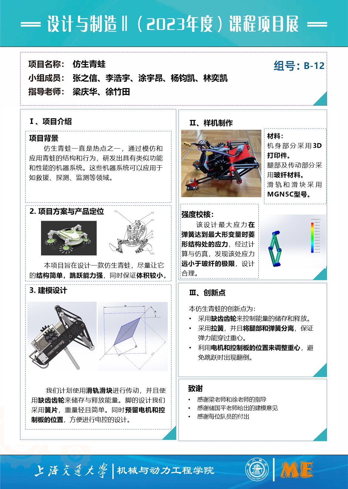 我们综合考虑了结构、重量以及力的传导,设计出了一款仿生青蛙。它跳跃能力强、结构简单、重量适中,但也存在些许缺点,如尺寸较大、落地不稳定等。