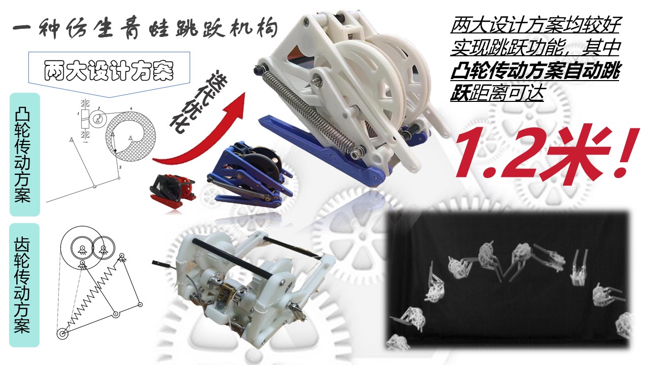 随着高性能机械的应用逐渐广泛,复杂的工作环境提出了复杂运动的要求,而生物在长期进化过程中形成了许多高效的结构,因此本小组制作出一种基于青蛙跳跃的跳跃机械,实现轻量化、小型化和低供能下的高性能跳跃,为高性能跳跃的机械设计提供解决思路。