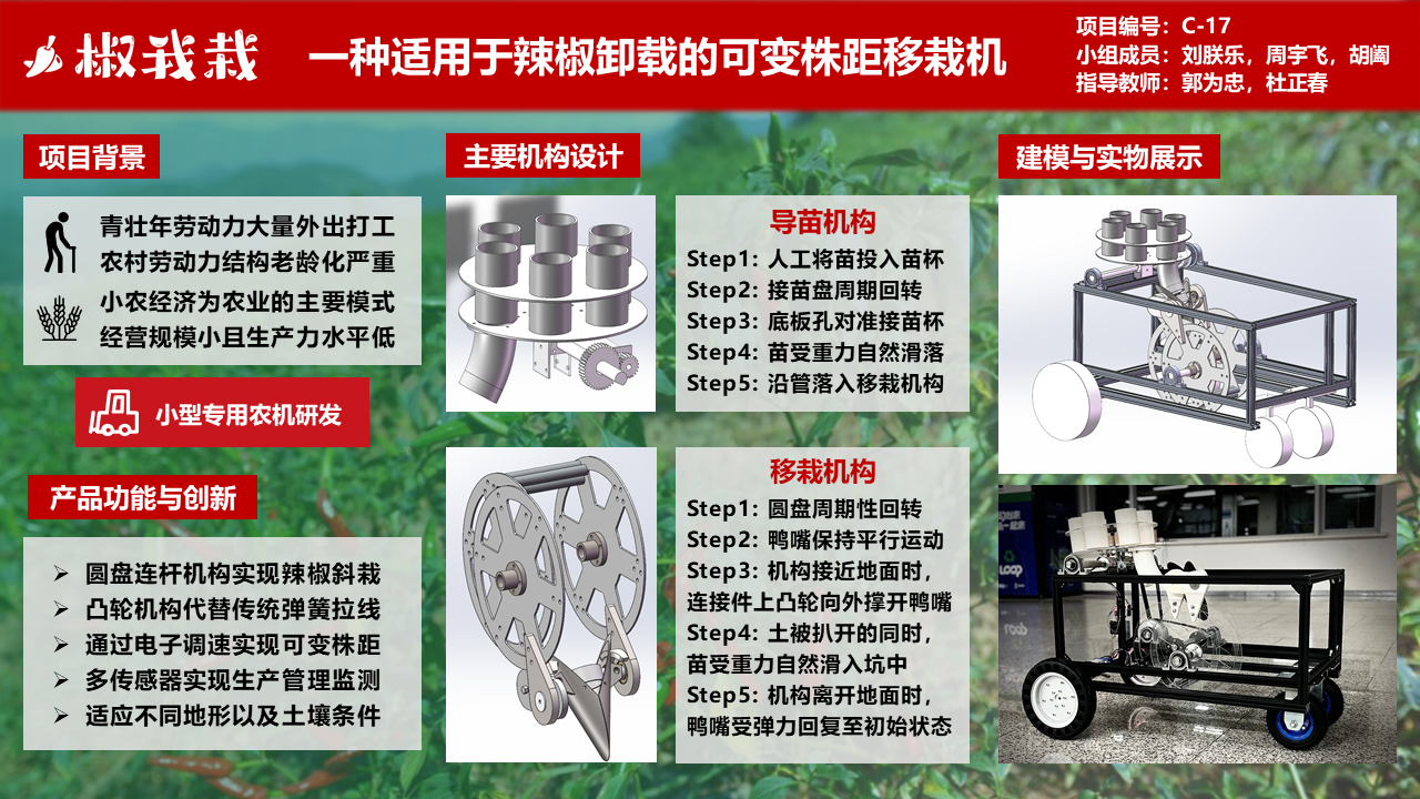 随着越来越多的农村青壮年外出打工,农村劳动力结构老龄化日益严重,使得农业生产效率和质量受到挑战。另一方面,在中国农业生产中,小农经济占据主要地位,具有经营规模小,机械化水平低,单位面积生产成本高等特点。上述两点都表明了小型农机研发的必要性。因此,基于第十一届全国大学生机械创新设计大赛的赛题,我们组设计出了一种适用于辣椒斜栽的可变株距移栽机。