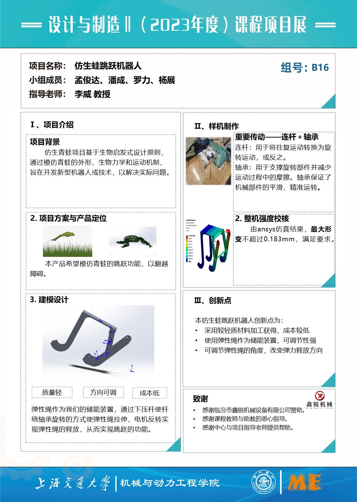 (1)设计可实现远距离和高高度的跳跃机制,仿生青蛙重量不宜太大,以达到又高又远的要求。