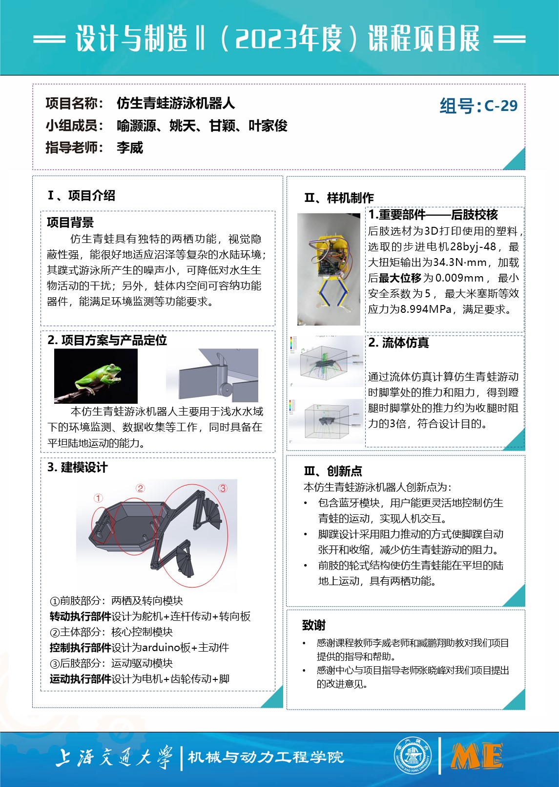 本项目模仿了青蛙的游泳运动,依靠电机传动仿生脚蹼实现游泳功能,再基于前肢滚轮进一步实现两栖运动功能。