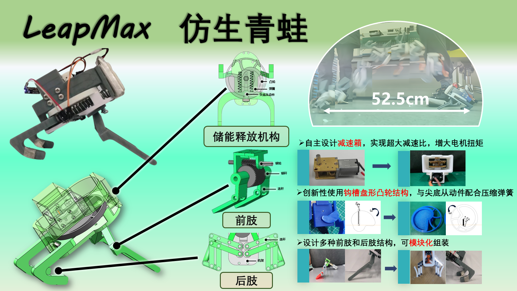 1. 搭建可跳跃的仿生青蛙机器人,最远跳跃距离达到52.5cm