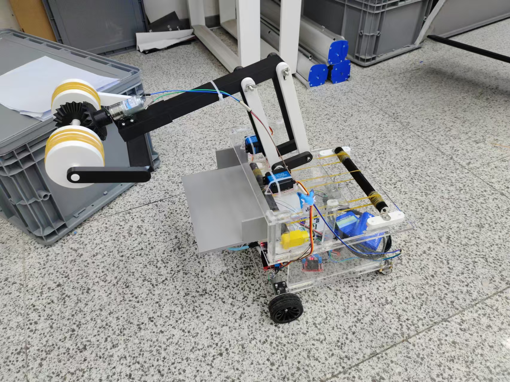 本项目成功设计并制造了一款滚筒移物机构。在机械设计方面,采用3D 打印滚筒加橡皮筋组合保障了纸张抓取,锥齿轮传动,底座小车可灵活移动并完成纸张转移。控制上实现了 A4 纸的自动抓取与转移,达到预期目标,为轻薄零件移取提供了有效方案。