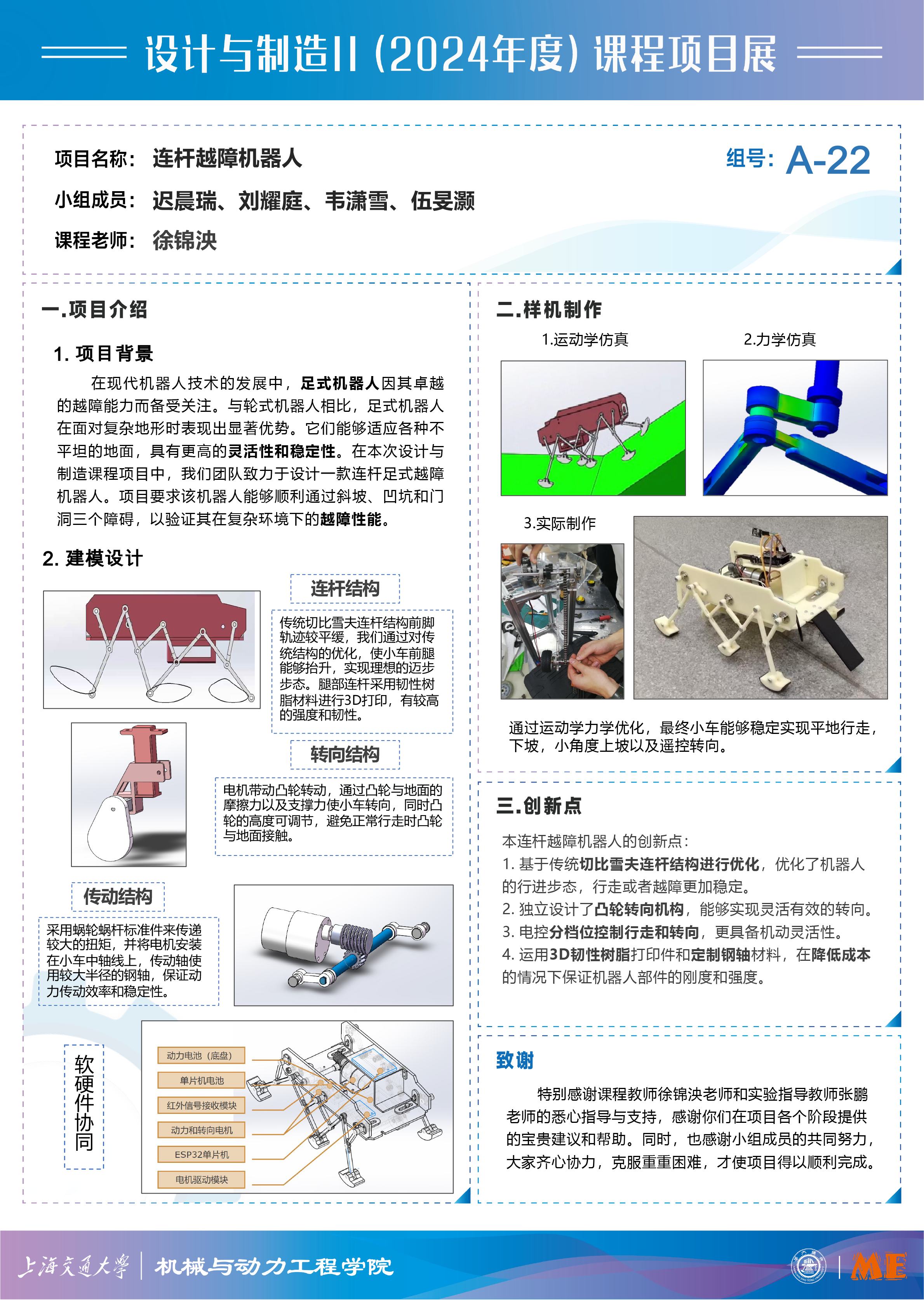 本项目基于切比雪夫连杆结构和esp32单片机,优化了传动和连杆设计,设计制造了一款能够实现各方向行走和低速越障功能的越障机器人。