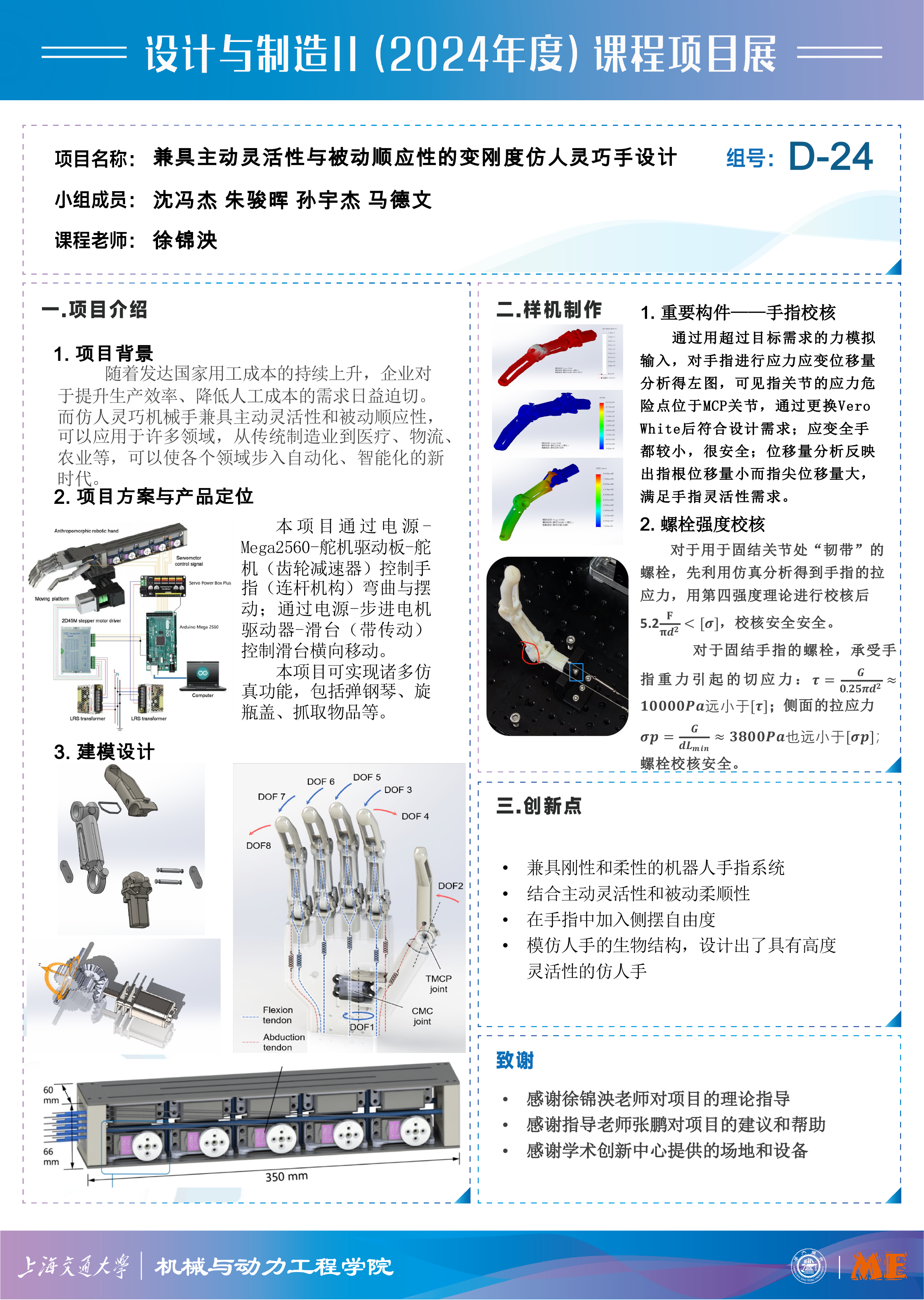 变刚度仿人灵巧手是以人手为参考、兼具主动灵活性和被动顺应性的机械手。其仿生的机械结构和舵机控制设计,使得它可以实现每根手指的自由活动,从而做到抓握、弹琴等许多动作;而弹性结构的加入,使得它可以响应随机的小冲击或小载荷突变,实现被动顺应的效果,从而获得类似人手的对外界的柔性适应能力