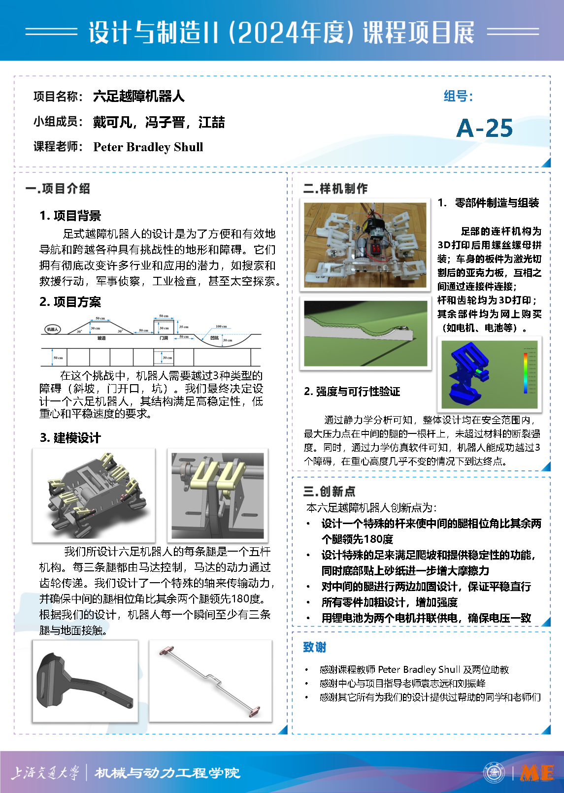 我们的最终设计是六足螃蟹状的越障机器人。它有六条腿,每条腿都是一个六杆机构。每三个支腿由电机控制,电机的动力由齿轮传递。我们设计了一个特殊的传动轴来传输动力,并确保中间腿的相位角领先其余两个腿 180 度。而根据我们的设计,每时时刻刻至少有三条机器人的腿在地面上。