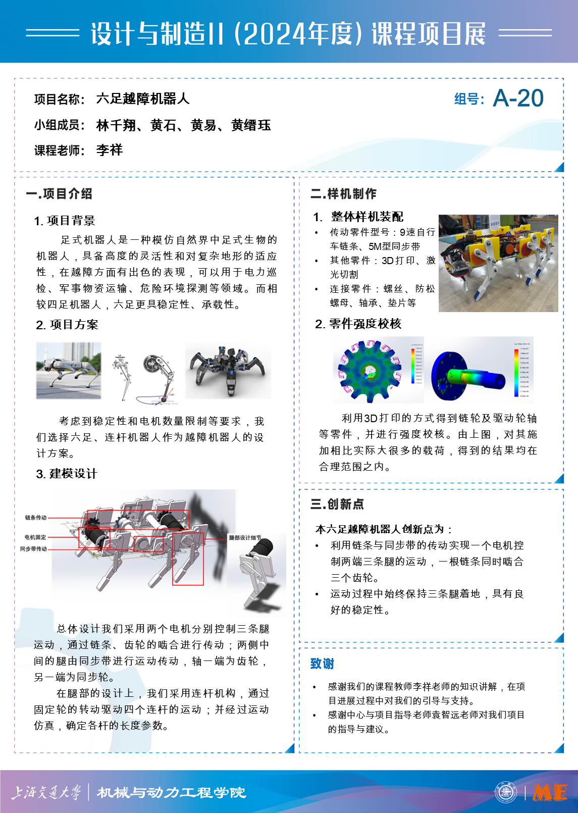 总体设计我们采用两个电机分别控制三条腿运动,通过链条、齿轮的啮合进行传动;两侧中间的腿由同步带进行运动传动,轴一端为齿轮,另一端为同步轮。