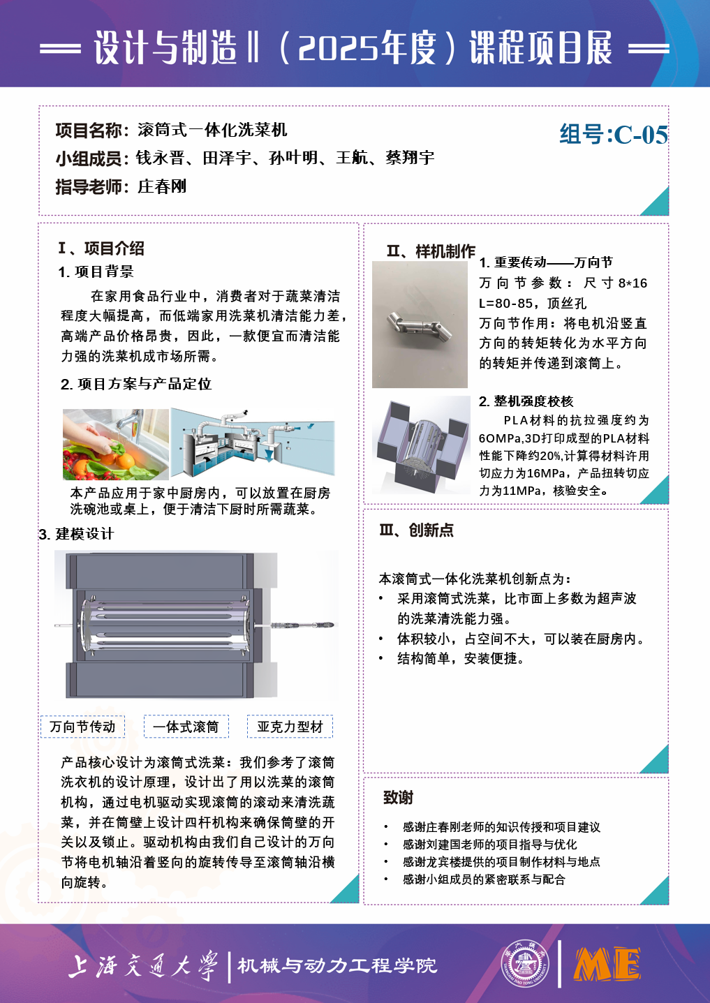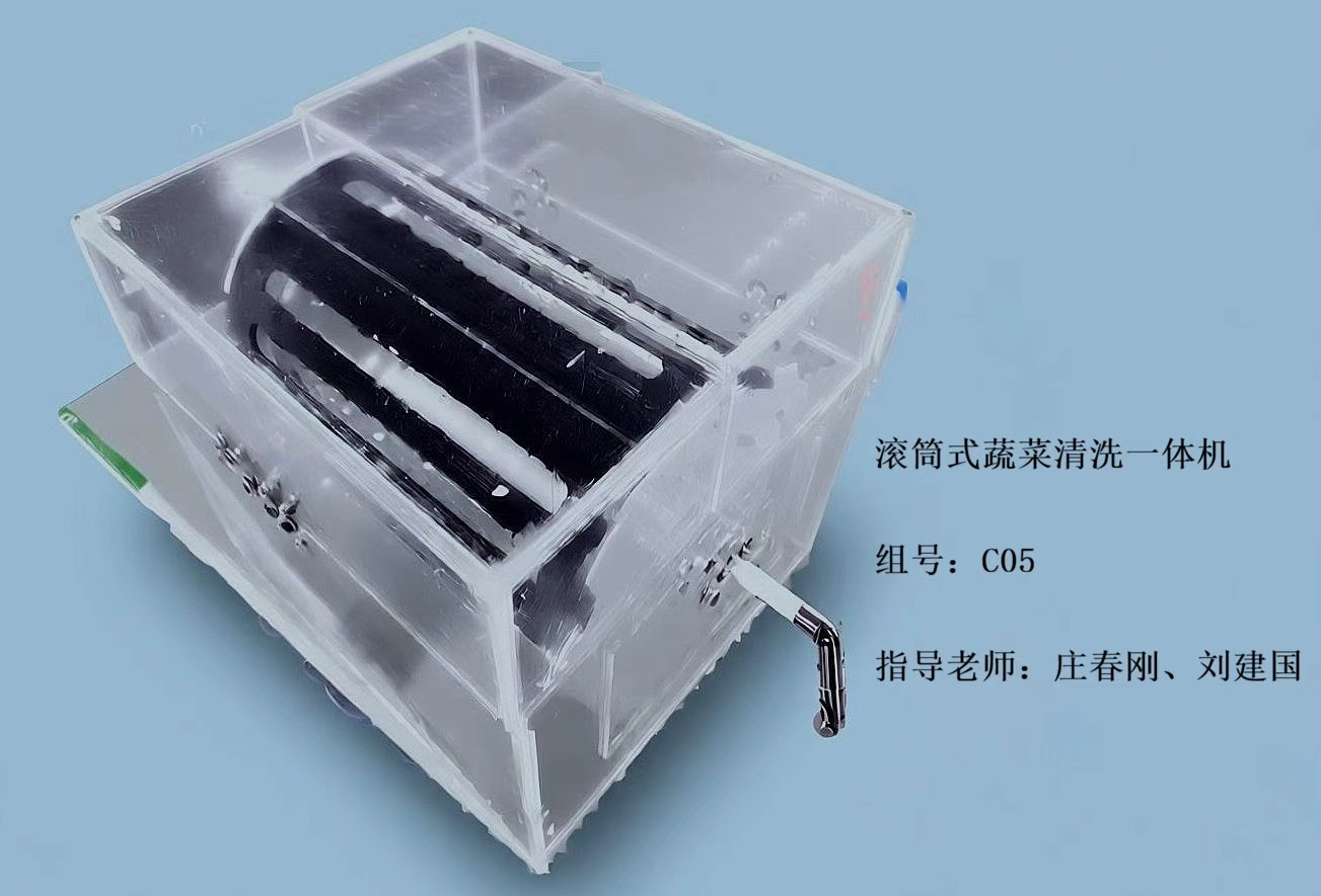 本项目针对当前食品安全需求升级与现有洗菜设备痛点,研发了一款兼具高清洁能力与高性价比的滚筒式一体化洗菜机。项目团队以滚筒洗衣机为设计原型,采用“亚克力外壳+3D打印滚筒”的核心结构,搭配同步电机与万向节传动系统,创新设计滚筒开合四杆机构。项目响应洗菜机市场的增长需求,填补了中低端高性价比洗菜设备的市场空白,未来可通过电机智能控制、搬运结构优化及传动系统升级进一步提升产品竞争力,具备广阔的市场推广前景。