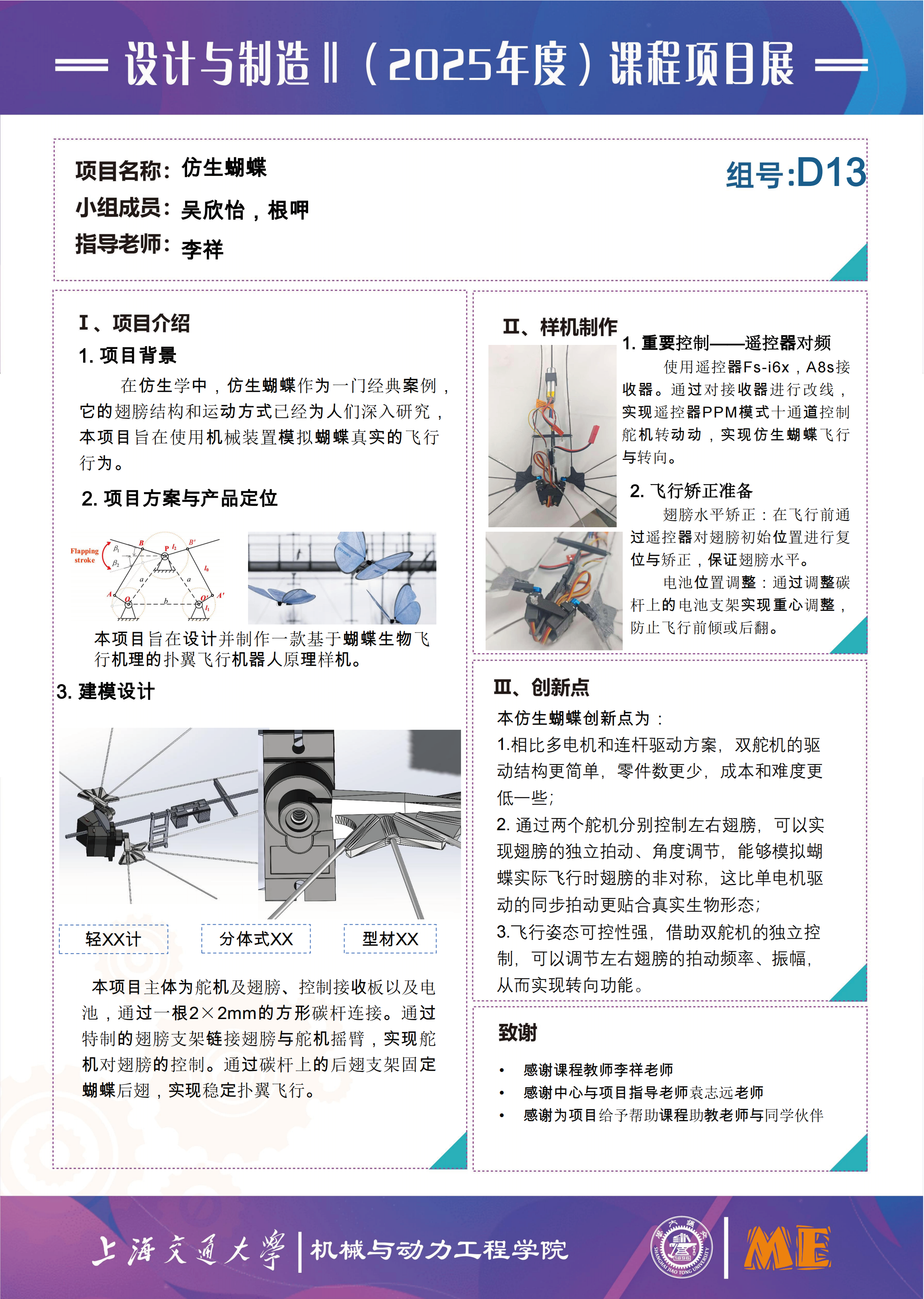 本项目以蝴蝶飞行机理为仿生核心,结合设计与制造、流体力学与工程实践等课程知识,聚焦扑翼飞行器的实现。项目摒弃传统电机-减速机驱动方案,采用双舵机直接驱动结构,搭配轻量化材料(如碳纤维、P31N风筝布)与定制飞控程序,通过i6x遥控器、A8S接收机的无线通信传输控制指令,构建“信号采集-数据处理-动作执行”的完整控制链路,旨在还原蝴蝶自然飞行状态,实现扑翼飞行器在动力匹配、姿态稳定性与轻量化设计上的技术难点。