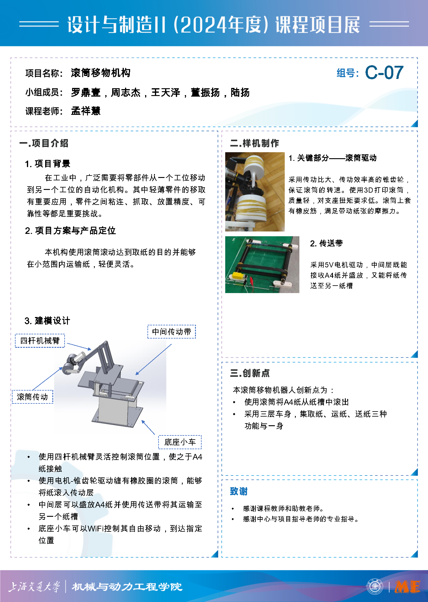 本项目成功设计并制造了一款滚筒移物机构。在机械设计方面,采用3D 打印滚筒加橡皮筋组合保障了纸张抓取,锥齿轮传动,底座小车可灵活移动并完成纸张转移。控制上实现了 A4 纸的自动抓取与转移,达到预期目标,为轻薄零件移取提供了有效方案。