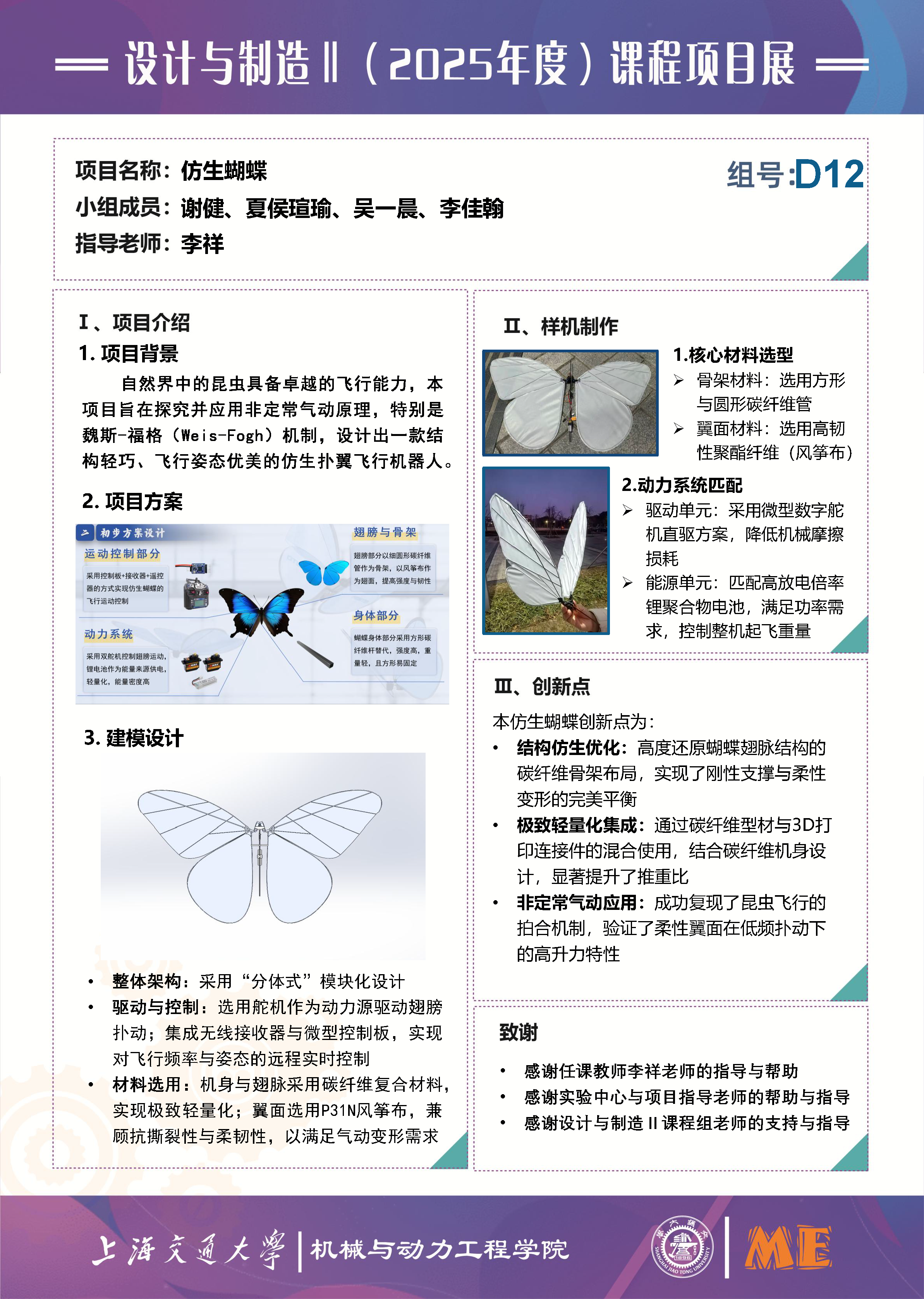1.  课程项目要求:本项目作为课程实践项目,核心要求是结合课程所学的设计与制造知识,完成仿生蝴蝶的全流程设计、制作与验证,实现理论知识与工程实践的深度融合,提升团队的工程设计与项目协作能力。