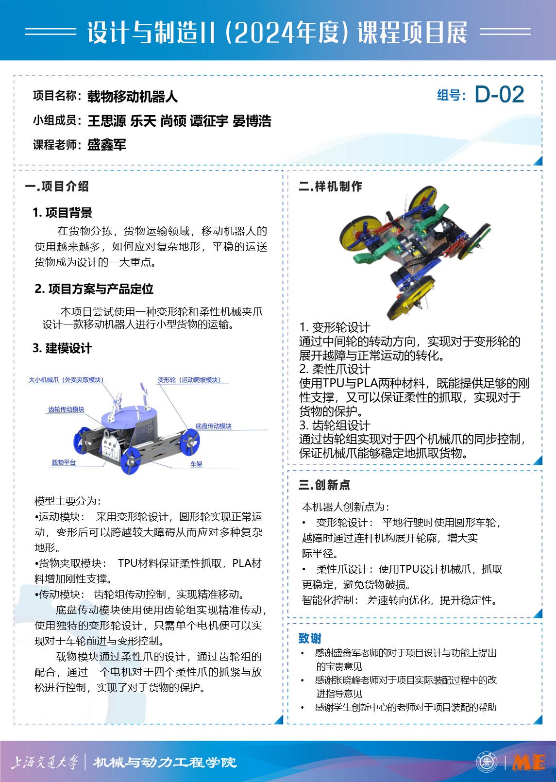 在货物分拣,货物运输领域,移动机器人的使用越来越多,如何应对复杂地形,平稳的运送货物成为设计的一大重点。本项目尝试使用一种变形轮和柔性机械夹爪设计一款移动机器人进行小型货物的运输。