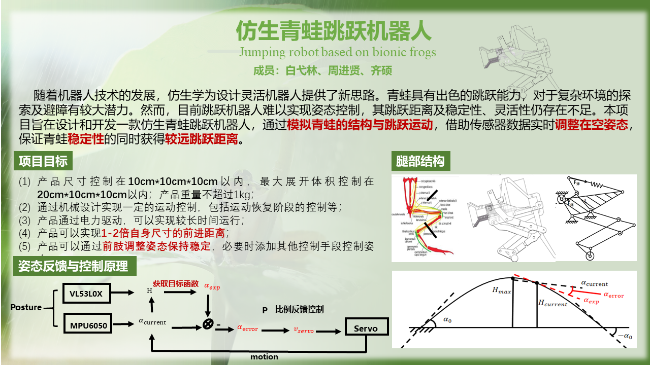 本项目旨在设计和开发一款仿生青蛙跳跃机器人,通过模拟青蛙的结构与跳跃运动,借助传感器数据实时调整在空姿态,保证青蛙稳定性的同时获得较远跳跃距离,具体达到以下目标: