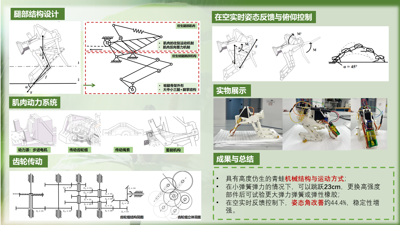 (1)高度仿蛙的机械结构与运动方式: 成功设计出与青蛙高度相似的跳跃机器人的轻量且稳定的机械结构,模仿青蛙蓄力、跳跃、姿态调整的运动方式;