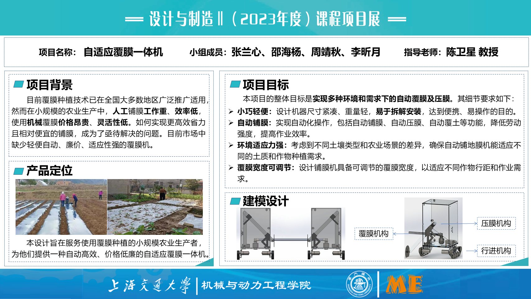 覆膜种植是我国农业生产的一大特色,且技术已经在我国大多数地区广泛推广。考虑到现有的覆膜机械不能针对性解决我国小规模农户在覆膜上费时耗力的问题,本项目组决定设计一款轻小自动、廉价简便、适应性强的覆膜一体机。该项目采用履带式行进装置以适应多种土质,自主设计了RRRP压膜杆件实现压膜深度和安全力度的可调节,并通过蓝牙模块实现两辆履带小车之间的通信与配合。