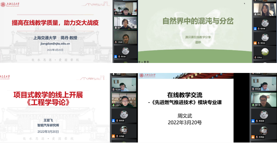 教学经验分享及交流研讨环节由王新昶主持。蒋丹作“提高在线教学质量,助力交大疫情”报告,围绕在线教学的问题及应对策略、有效方法、教学感悟三方面作了介绍,表示应以学生为中心,开发多样化教学活动,提高学生学习兴趣,帮助学生线下、线上学习过渡过程平稳进行。谭婷分享了通识课程在线教学经验,提出通过增设课堂讨论、课堂故事和科普介绍等环节,提高学生课程参与度。王亚飞和周文武分别以《工程学导论》、《先进燃气推进技术》教学为例,分享了教学方法及方式技巧,强调了师生互动的重要性。