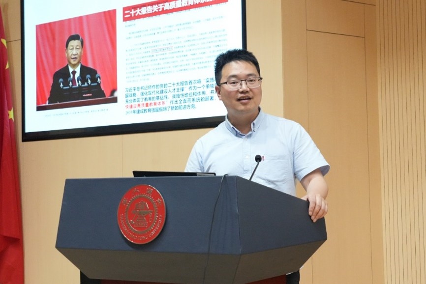 买球官方网站副院长夏唐斌从学院概况、师资队伍、人才培养及教师教学发展等方面,汇报了学院本科教育教学情况,详细介绍了学院一流本科专业方向、深度与广度相结合的交叉融合课程、基于项目式教学的创新实践、多元化的国际交流模式、交叉前瞻的创新研究领域等特色教学工作。