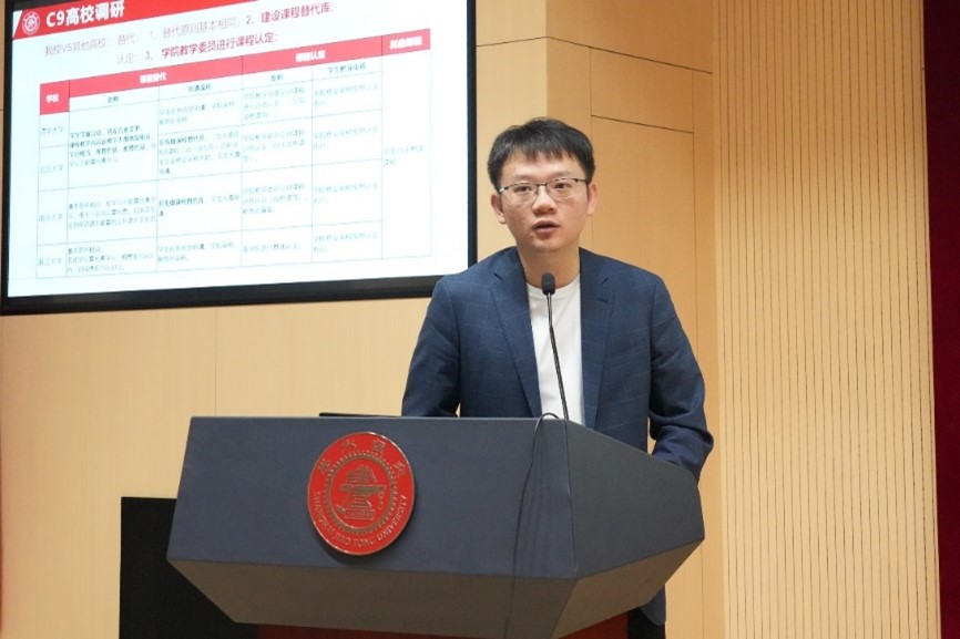 校教务处副处长王鸿东汇报了自主转专业新政策下的课程替代方案调研情况,以及实施路径,表示将组织校院协同沟通会与论证会,联合建设课程替代查询库,全面保障学生修业及培养。