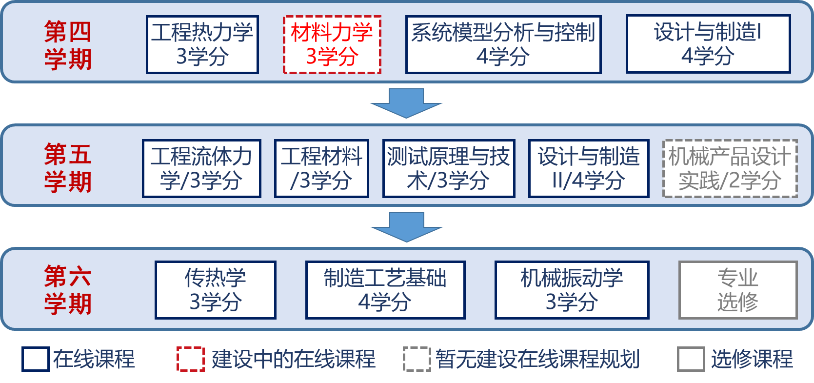机械工程专业第四到第六学期的核心必修类课程如上图所示。其中,第五学期《机械产品设计实践》课程主要集中在智能制造基础方面的知识,也就是智能制造理念指导下的机械制图表达,结合《设计与制造Ⅱ》课程一起进行。由于这门课程主要是实践类,难于策划在线课程,所以暂无在线课程建设计划。