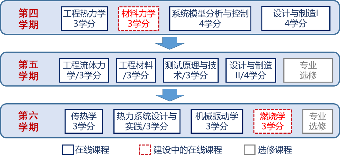 (4)针对热学与流体主线,设置了《工程热力学》、《流体力学》、《传热学》、《热力系统设计与实践》逐级进阶的四门专业基础课程。