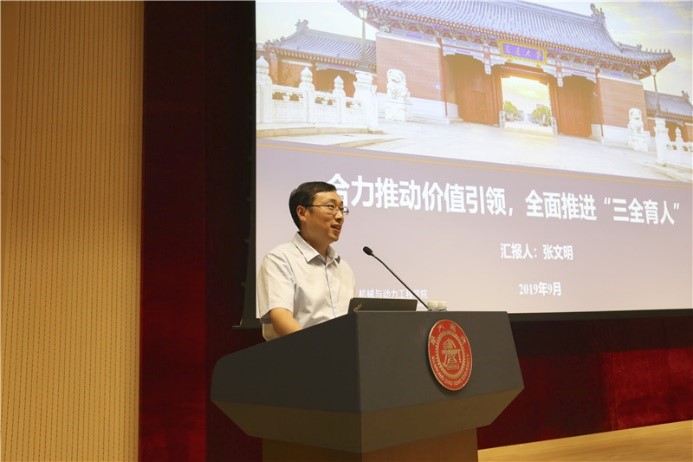 党委副书记张文明以“合力推动价值引领, 全面推进三全育人”为题,介绍了学院“三全育人”工作开展情况及努力方向。作为全校唯一入选教育部首批“三全育人”综合改革试点单位,学院明确“为谁培养人”的办学方向和“培养什么样的人”的育人导向,围绕“怎样培养人”探索全员、全过程、全方位育人机制。他指出,学院将通过构建“大德育、大思政”全员育人工作平台,建立“面向全体、分类引导、重点培养”全过程育人长效机制,打造“多维度、多元化、多平台”的全方位育人品牌模式,通过课程育人、科研育人、实践育人、资助育人等举措,加强顶层设计,发挥班主任、导师、思政教师、校友合力作用,努力将办学优势转化为育人优势,培养具有家国情怀、国际视野和行业理想的大制造领域建设者和接班人。