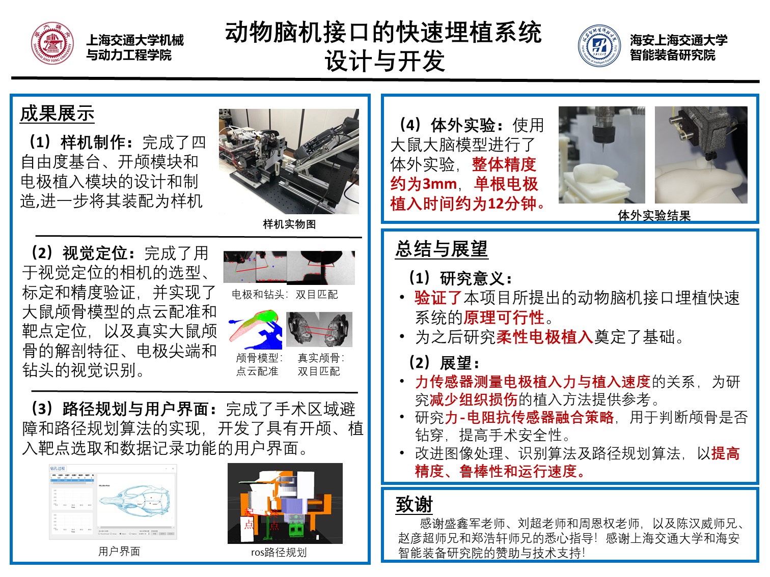1. 研究高精度、高安全性、高灵活性的传动机构、开颅模块和快速植入模块,达到快速且可靠的植入要求。
