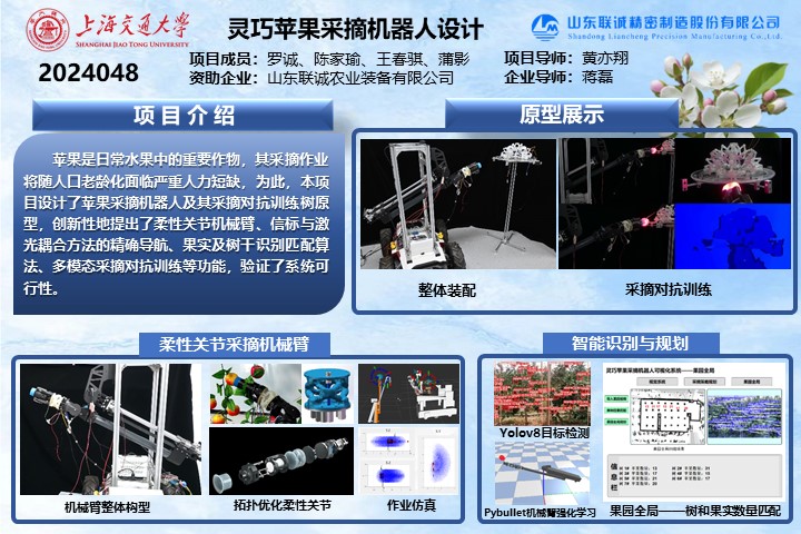 本项目拟设计一款具有自动采摘、自主导航、资源配置和作业评估等功能的苹果采摘机器人系统。项目共分为四个子任务:采摘机械臂的设计与控制、移动系统的设计与制造、果实采摘对抗训练机器人设计与制造,以及多场景采摘作业策略与智能体协作。该系统通过移动底盘的自主精准导航,定位至果树附近,利用智能采摘算法进行机械臂关节轨迹规划,实现采摘作业的功能,并且可以在对抗训练机器树上进行采摘作业训练。