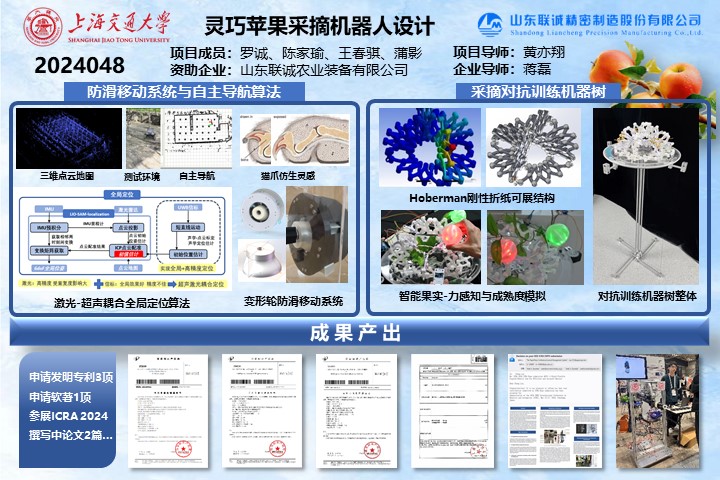 本项目完成了采摘机械臂的设计与控制、移动系统自主精准导航、采摘识别与机械臂路径规划、对抗训练机器树的设计与制造。本项目设计的灵巧苹果采摘机器人系统,可以完成快速无损的苹果采摘作业,在无人化果园中具有广阔的应用前景。本项目设计的对抗训练机器树,可以对采摘作业质量进行标准化分级评价,在采摘机器人研发领域也有着广阔的应用前景。本项目目前已申请国家发明专利3项、软件著作权1项,本项目设计的机械臂已参展2024 IEEE ICRA会议,另有两篇论文正在撰写中。