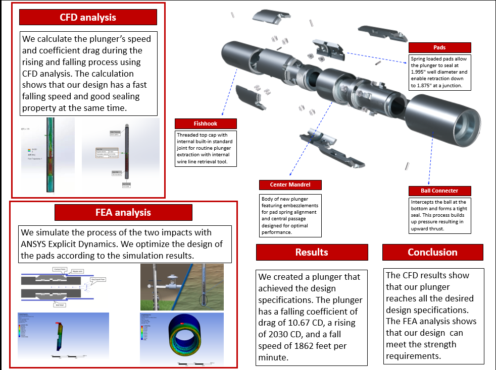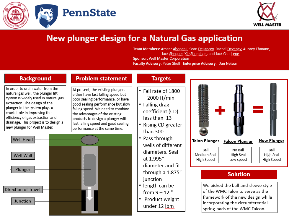 In order to drain water from the natural gas well, the plunger lift system is widely used in natural gas extraction. The design of the plunger in the system plays a crucial role in improving the efficiency of gas extraction and drainage. This project is dedicated to designing a new plunger for Well Master.