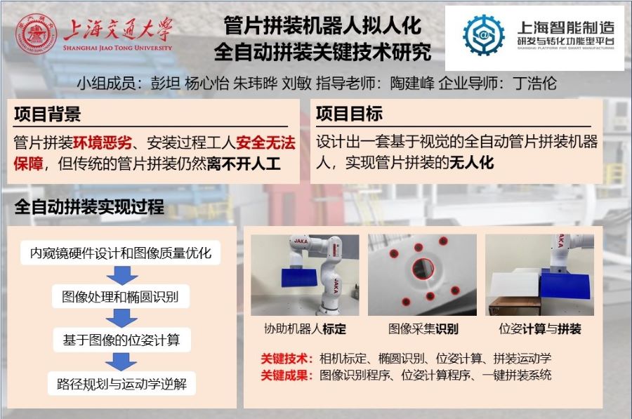 项目主要目标包括制定全自动拼装方案、开发视觉感知终端样机、设计基于机械视觉的管片对准算法并完成实验验证。首先,利用相机及相关硬件搭建视觉感知终端样机;其次,运用视觉图像处理和优化算法,为基于视觉的待拼装管片螺栓孔对准提供软件支撑;然后,通过位姿计算算法求解待拼装管片相对已拼装管片的位姿信息;最后,利用这些位姿信息,规划拼装机的运动路径,通过六自由度协助机器人模拟常规管片拼装动作,验证相关技术的有效性。