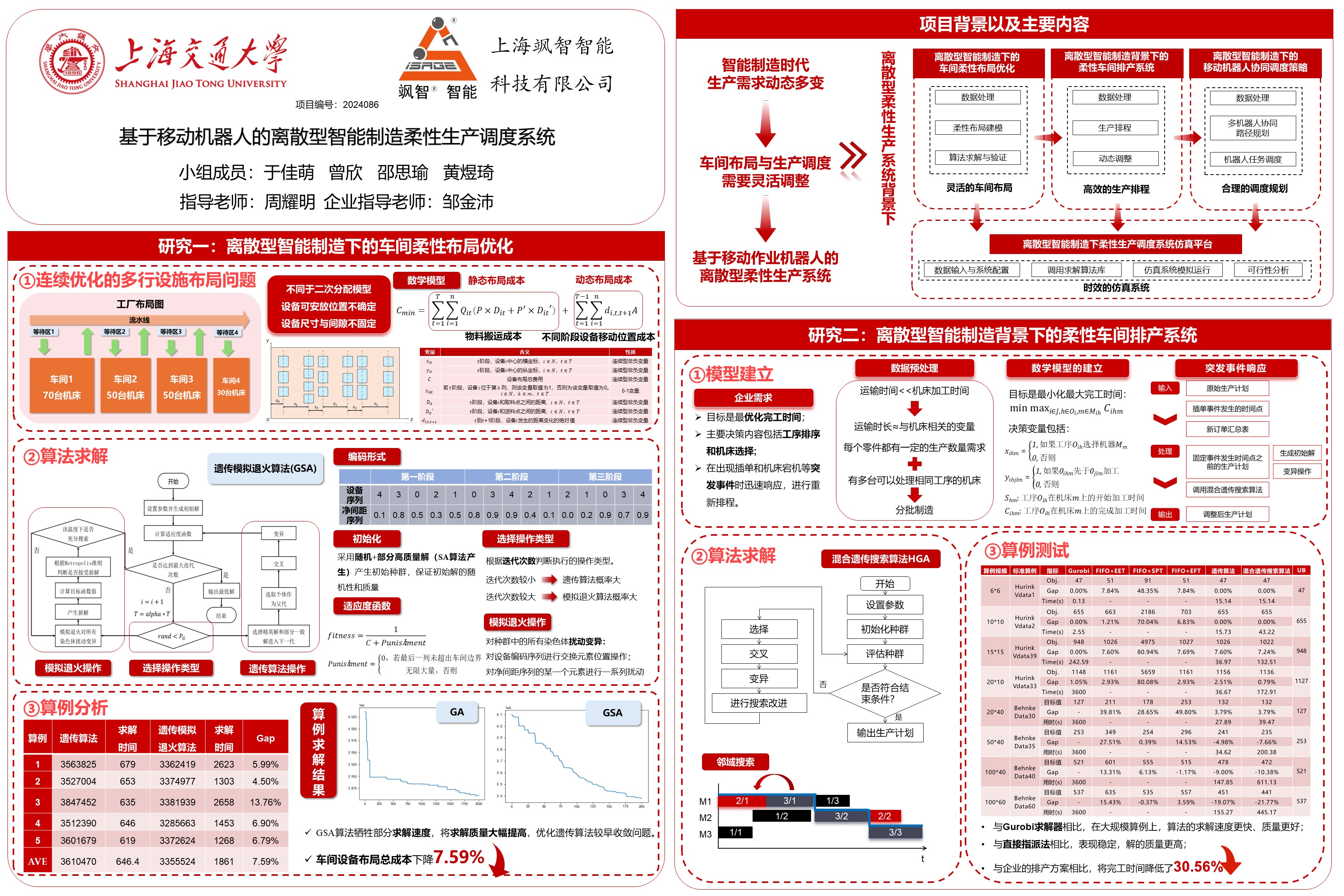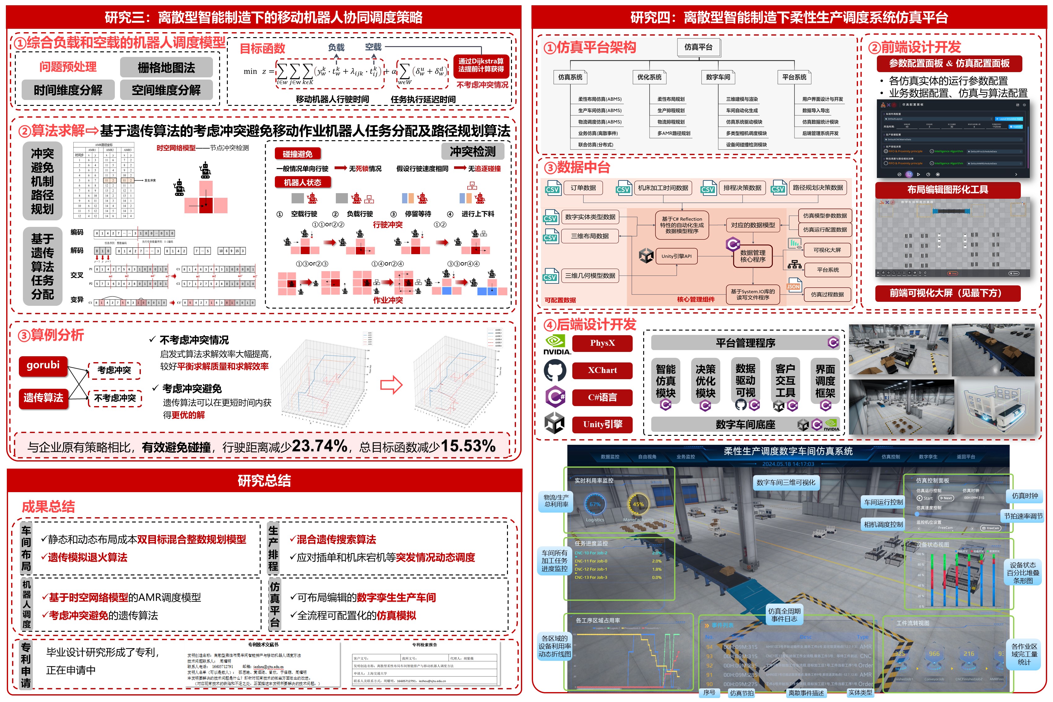 离散性智能制造下的柔性生产,在当前小批量多品种生产需求场景下具有重要意义。其中移动作业机器人(AMR)能够实现可移动共融作业,在工业生产中具有灵活性,广泛应用于生产制造的内部物流。本项目设计了一种离散型柔性布局车间智能排产与移动机器人调度方法,同时考虑了离散型制造下柔性车间布局的生产排程和移动作业机器人的调度,采用启发式方法在保证精度的情况下,提高求解效率。