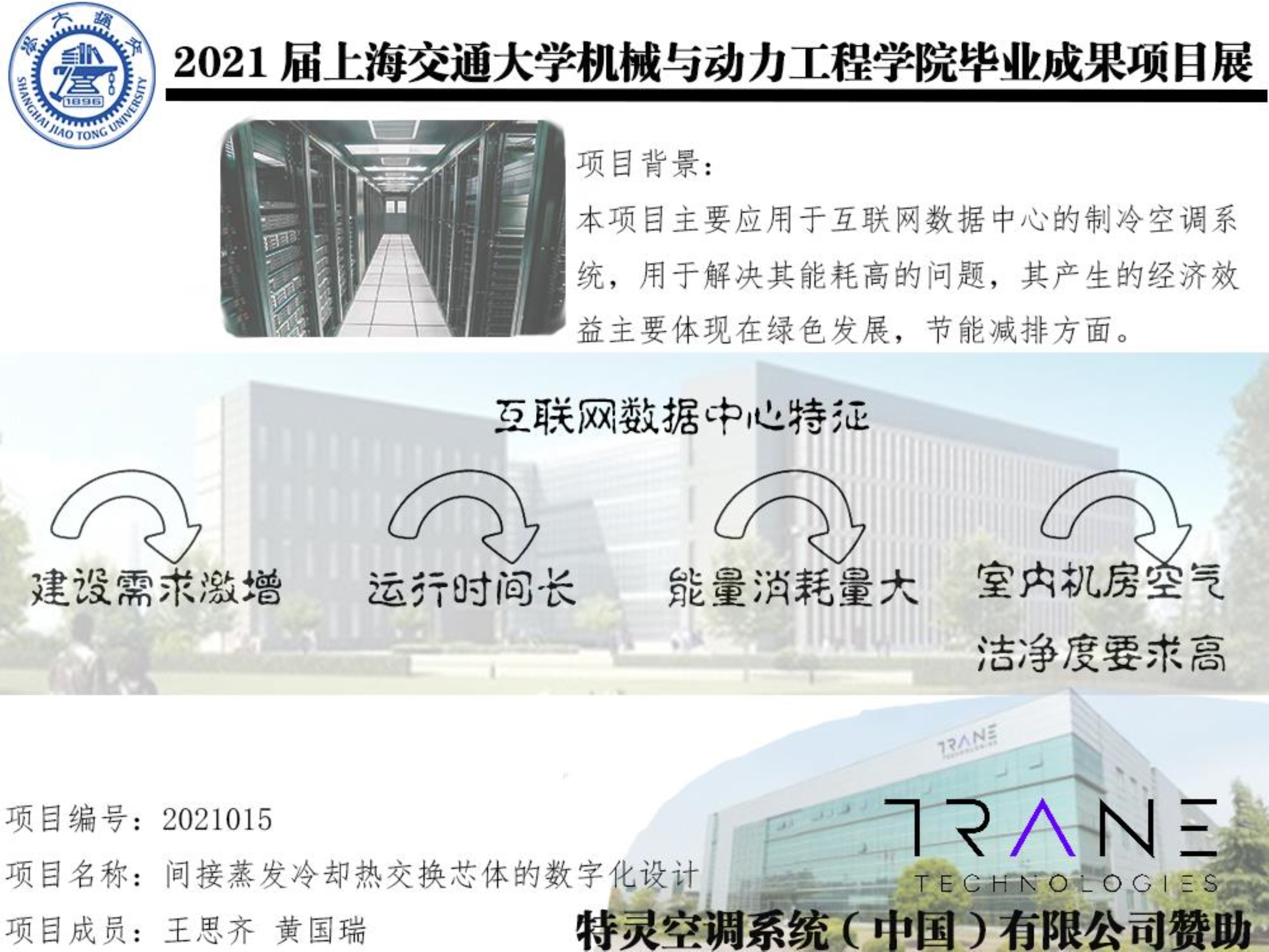 本项目为间接蒸发冷却热交换芯体的数字化设计,由买球官方网站买球官方网站本科毕业设计小组与特灵空调系统(中国)有限公司联合展开。本项目旨在通过调研间接蒸发冷却技术的发展及研究现状,设计出一款利用自然冷能的间接蒸发冷却换热芯体,用于数据中心机房的制冷系统,达到降低数据中心制冷系统能耗的目的。设计的换热芯体需要达到特灵空调系统(中国)有限公司提出的换热效率要求、使用风量要求,并向企业提供结题报告。