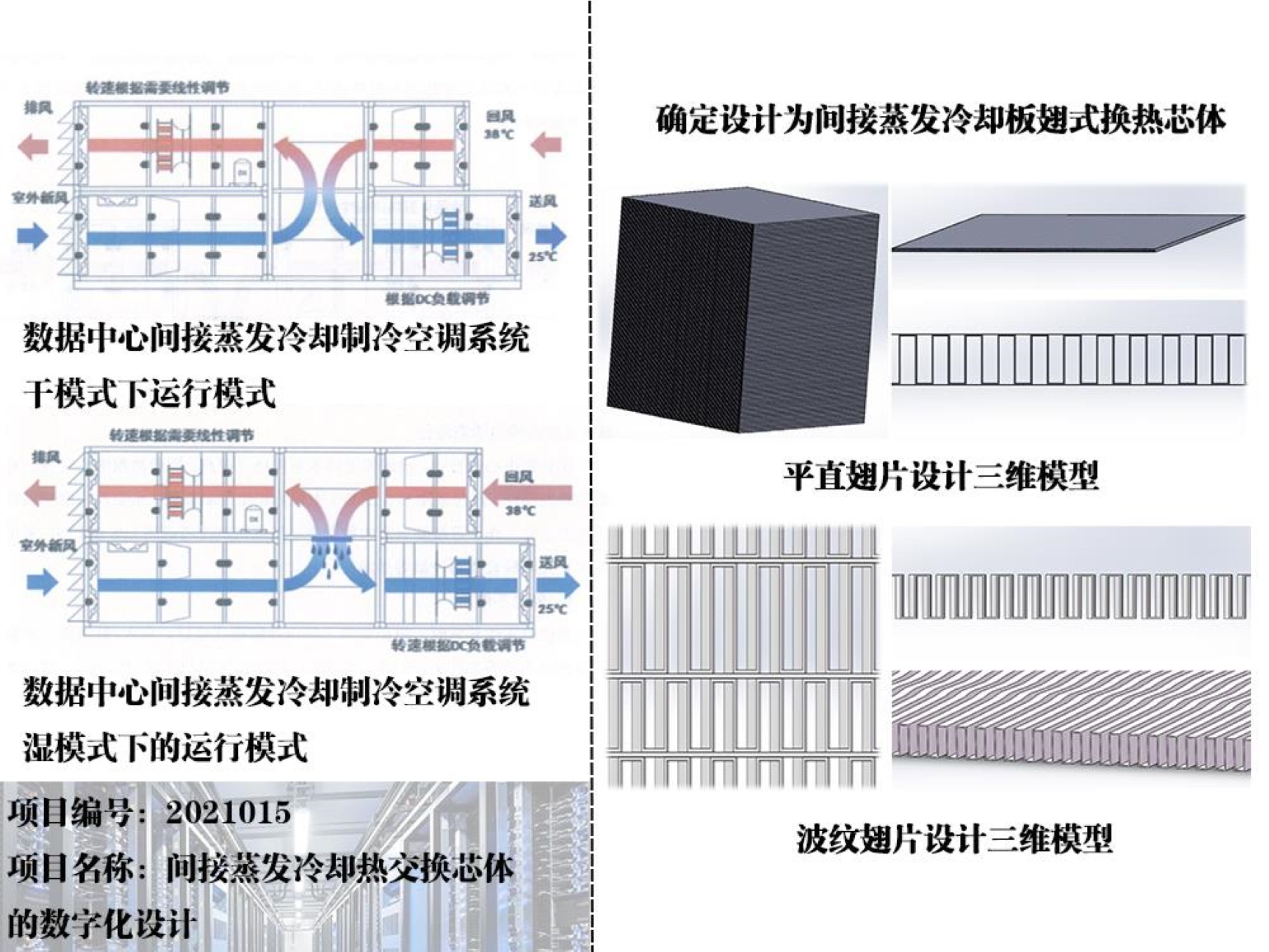 本项目根据特灵空调系统(中国)有限公司的要求,计划设计出一款板翅式间接蒸发冷却换热芯体用于IDC数据机房的制冷系统。目标为板翅式换热器需要能够满足机房回风量不小于20000CMH;设计的换热芯体具有干、湿两种运行模式,两种模式下都具有高换热效率,干模式不小于60%,湿模式不小于70%,换热芯体内的流体流动阻力要小,压降不大于400Pa。